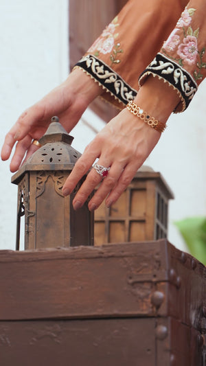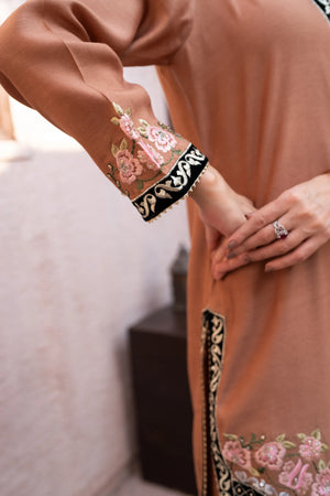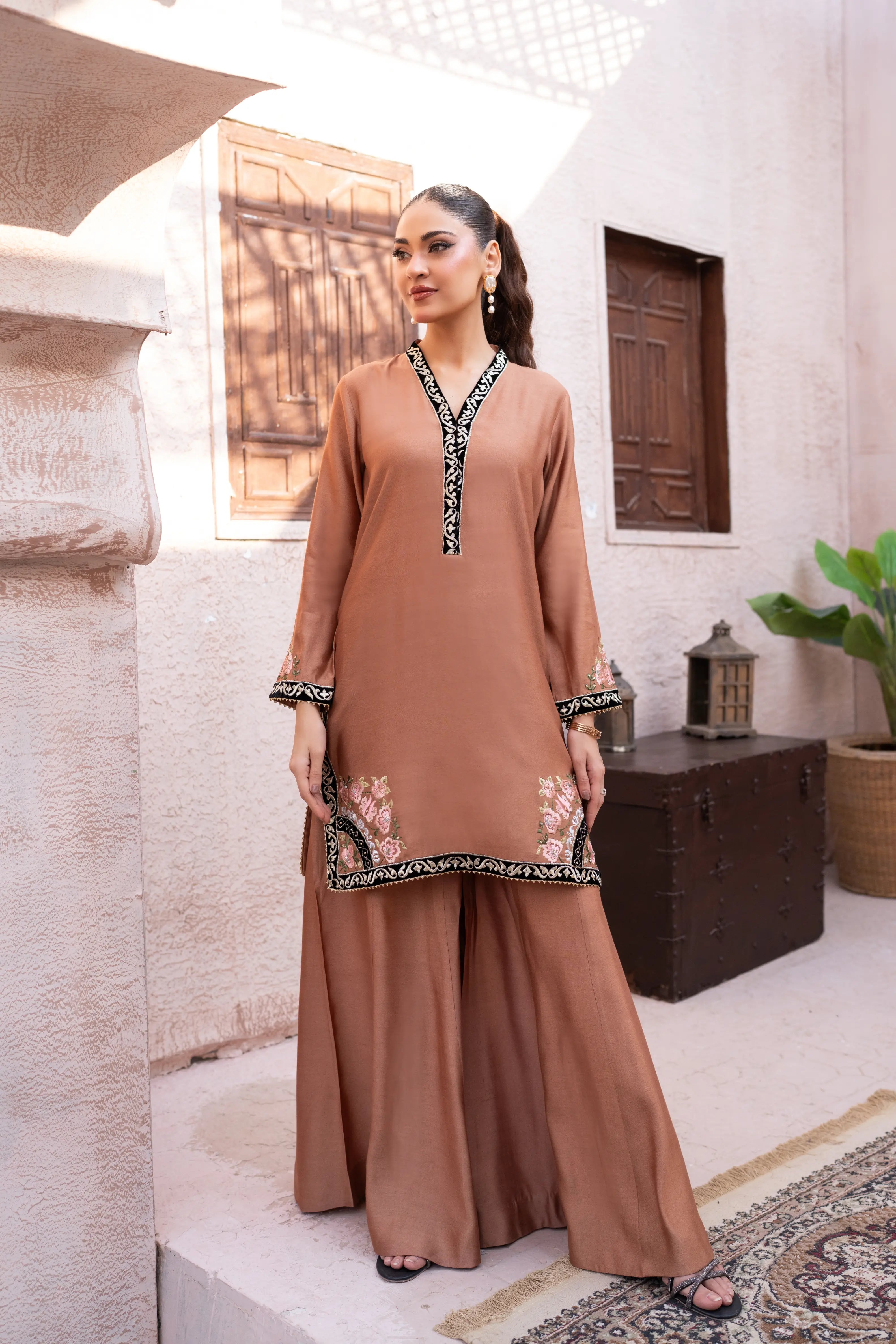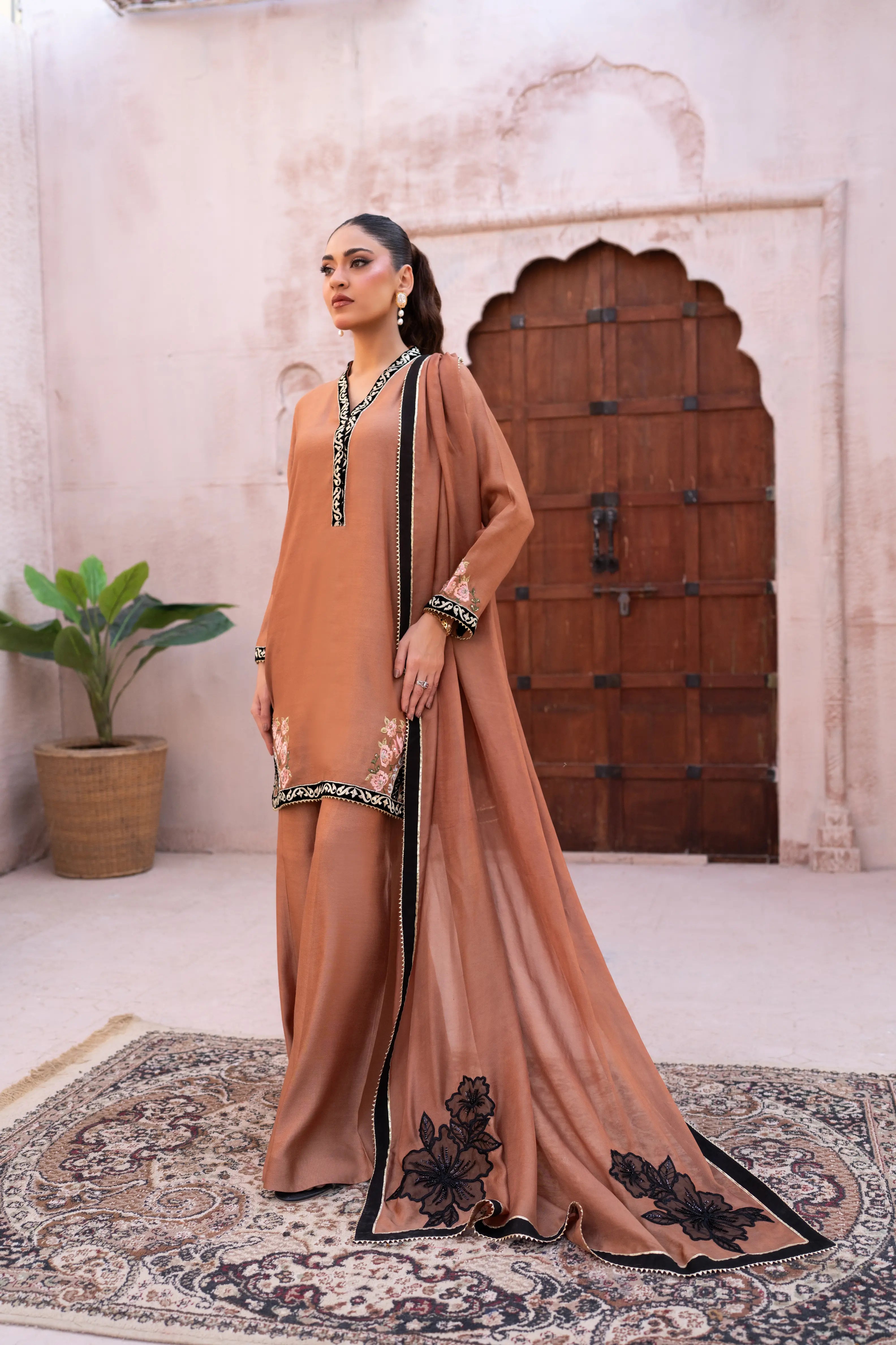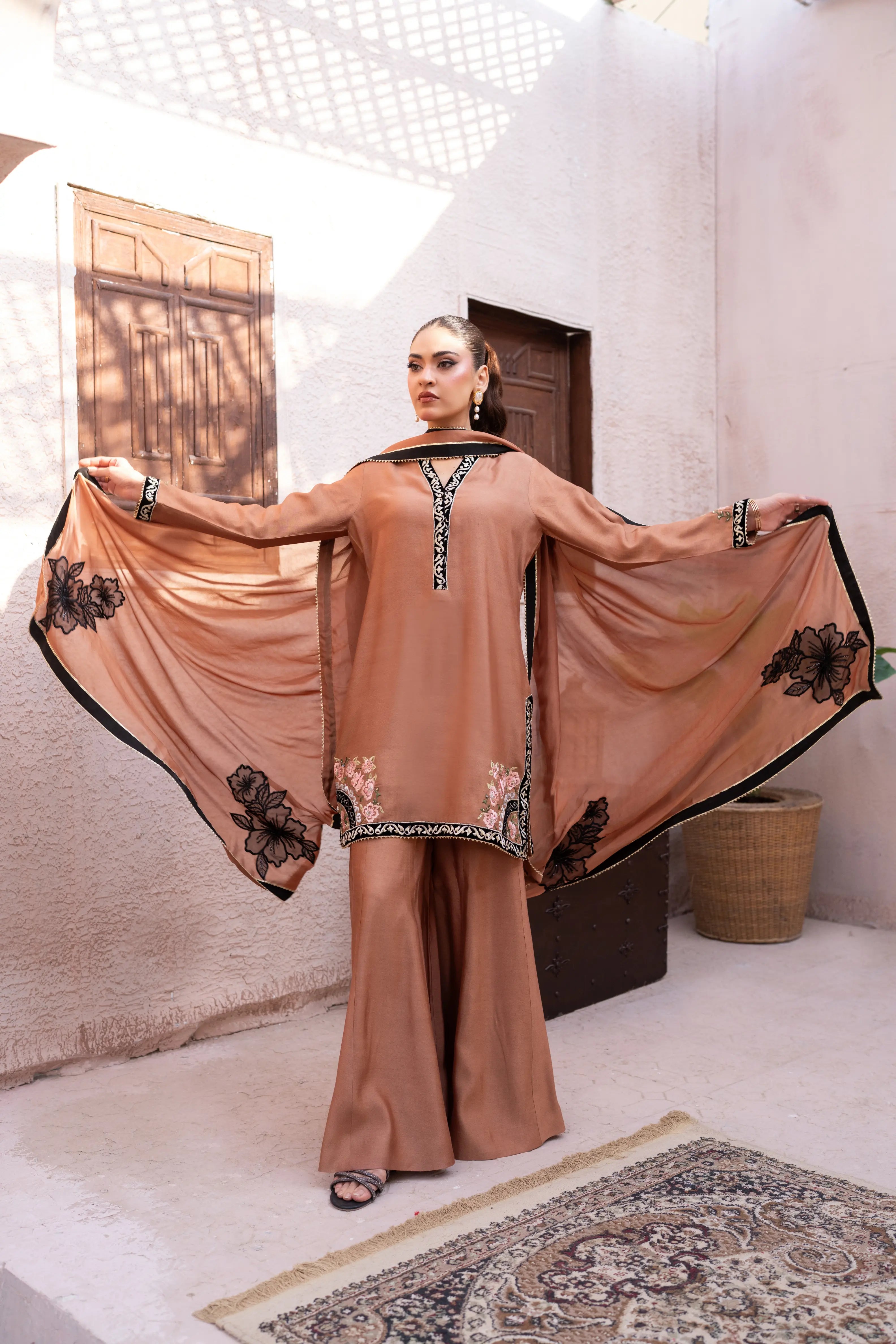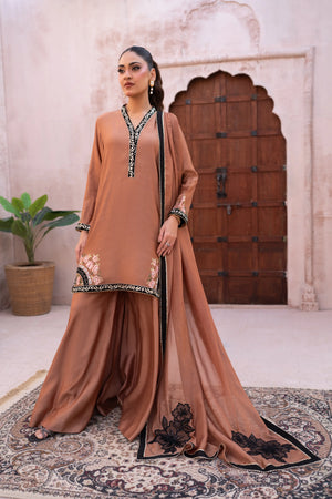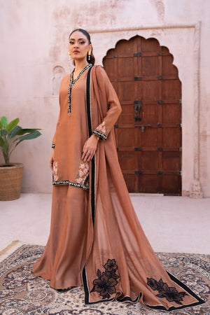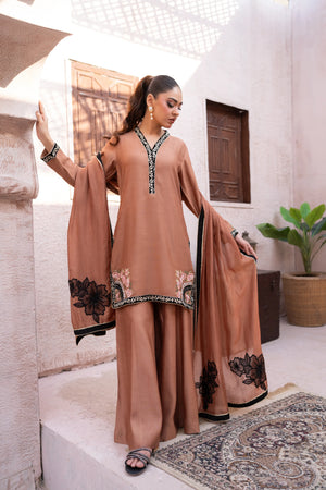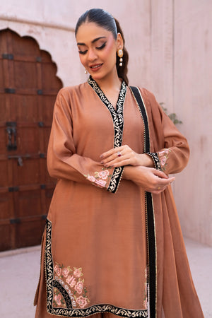 Designed in luxurious toffee brown khaadi silk, this elegant suit offers a refined silhouette. The shirt features rich velvet edging with delicate till work on velvet, while contrast embroidery highlights the hem. The medium silk dupatta is adorned with intricate applique work, adding graceful movement. Finished with statement Dhaka pants, this ensemble is perfect for evening gatherings, lunch, and special occasions, blending timeless craftsmanship with effortless style.