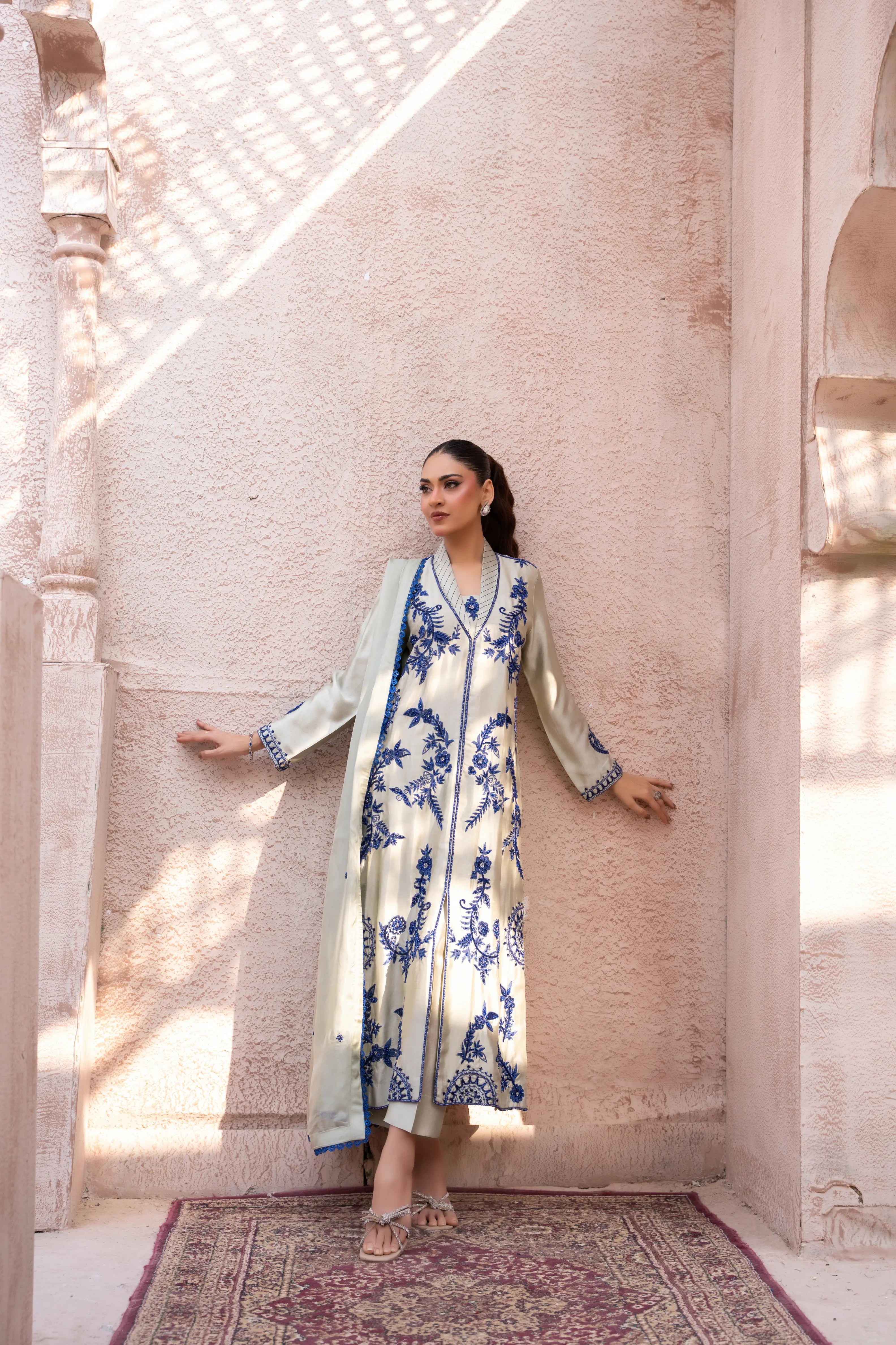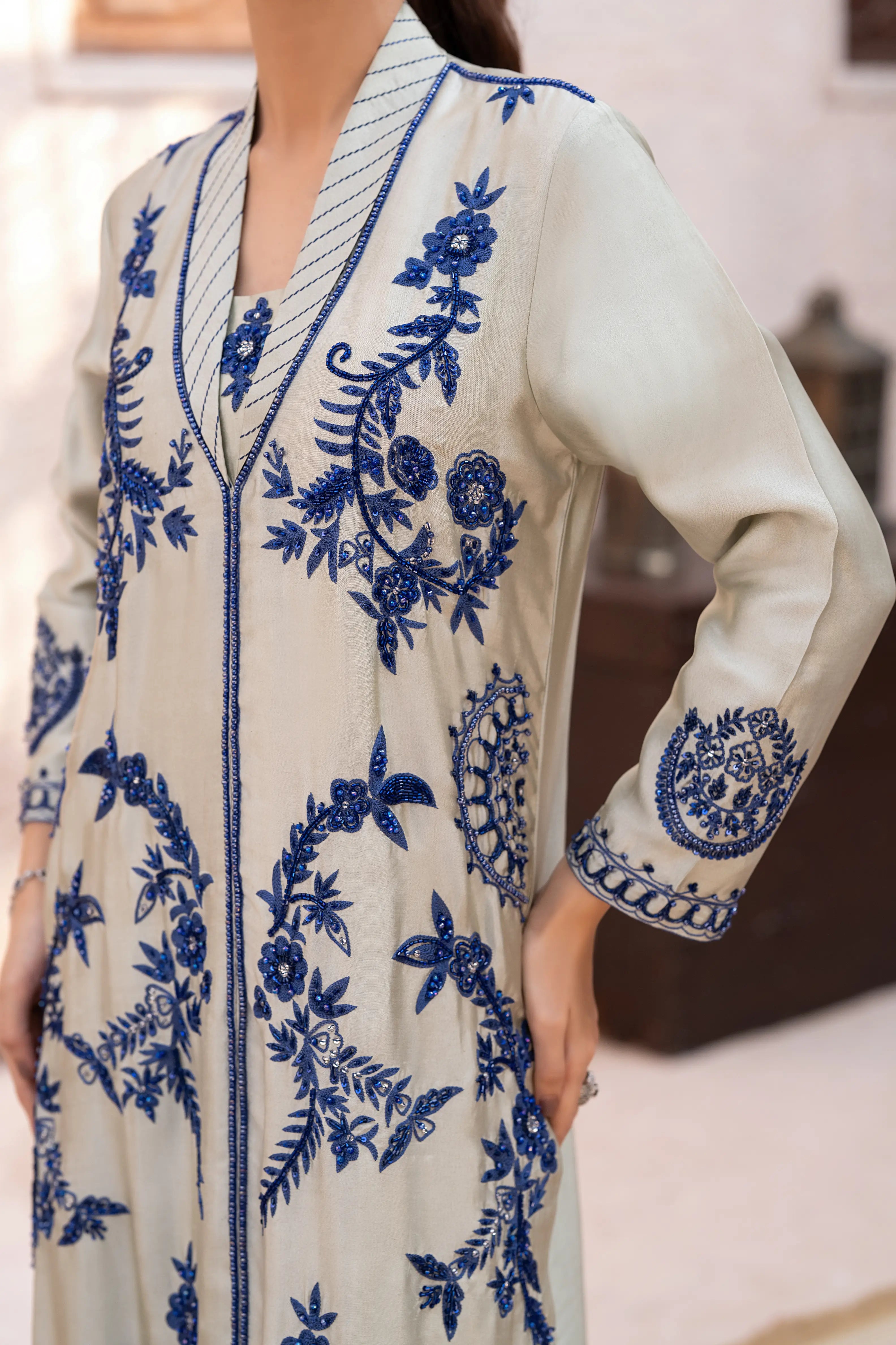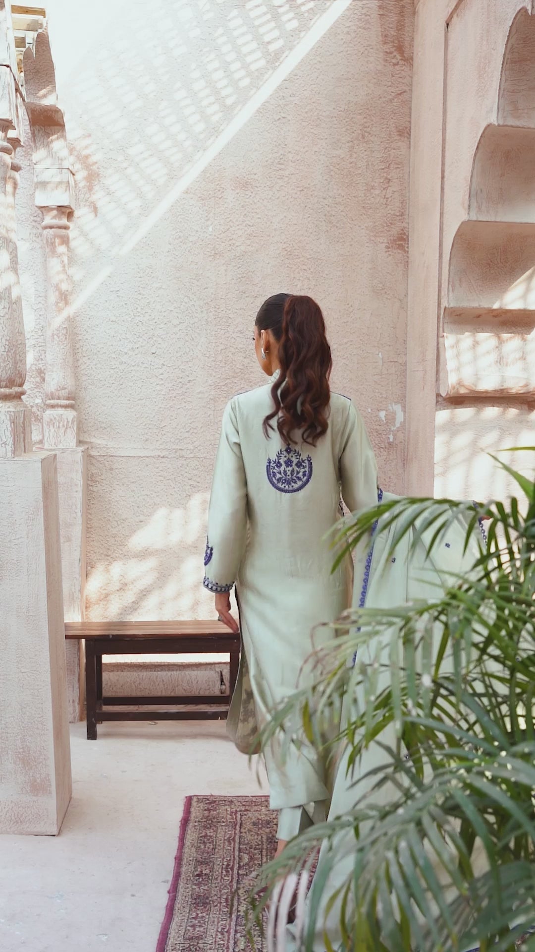 Crafted on luxurious sheesha silk, this graceful ensemble is paired with a medium silk dupatta and features delicate handwork with pearls, cut dana, and fine aari thread embroidery. Thoughtfully detailed for a soft festive shimmer, it’s perfect for serene evenings and joyful celebrations, designed to make you feel happy, confident, and effortlessly elegant.