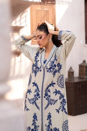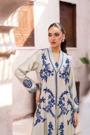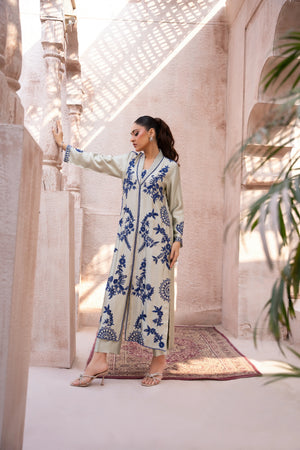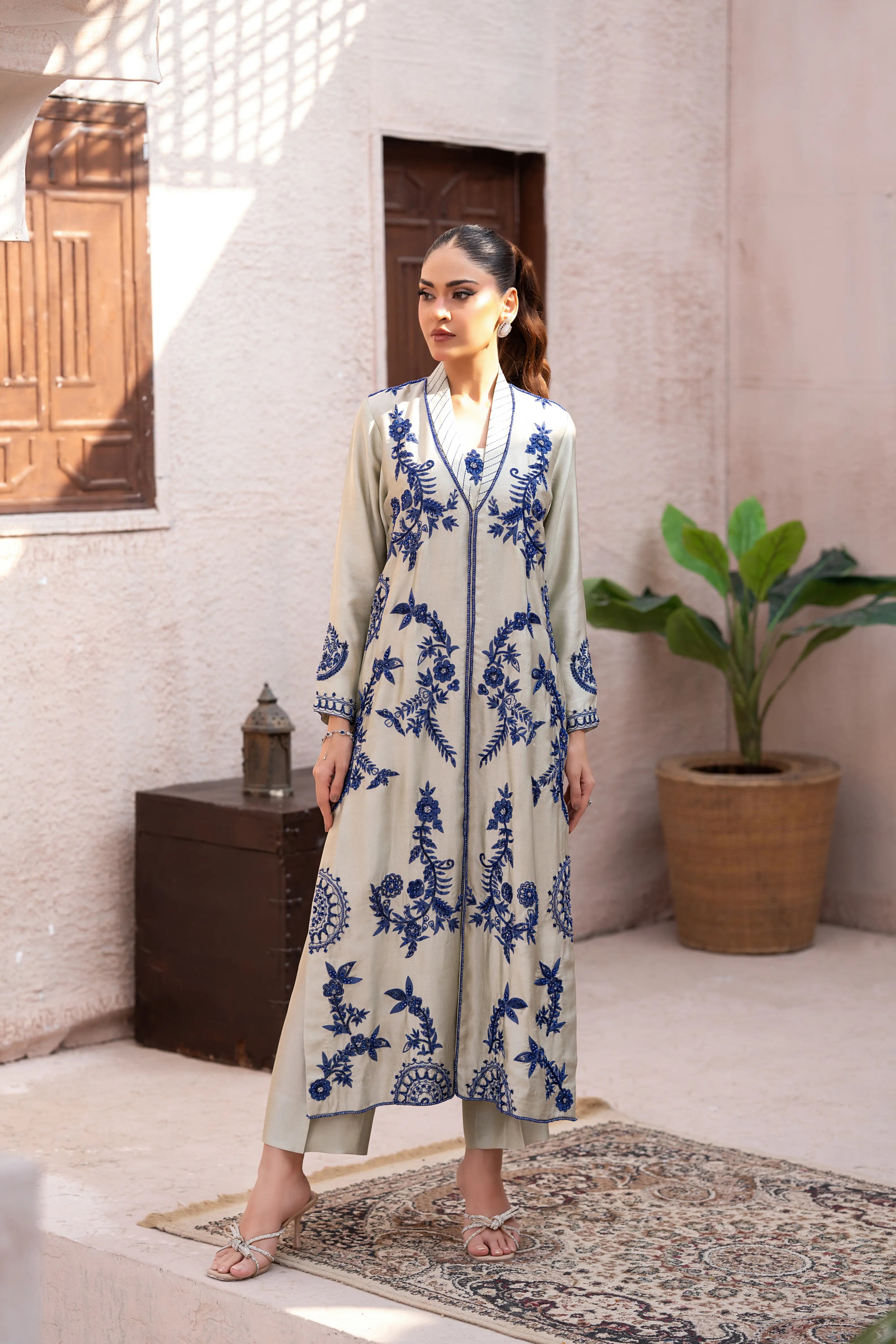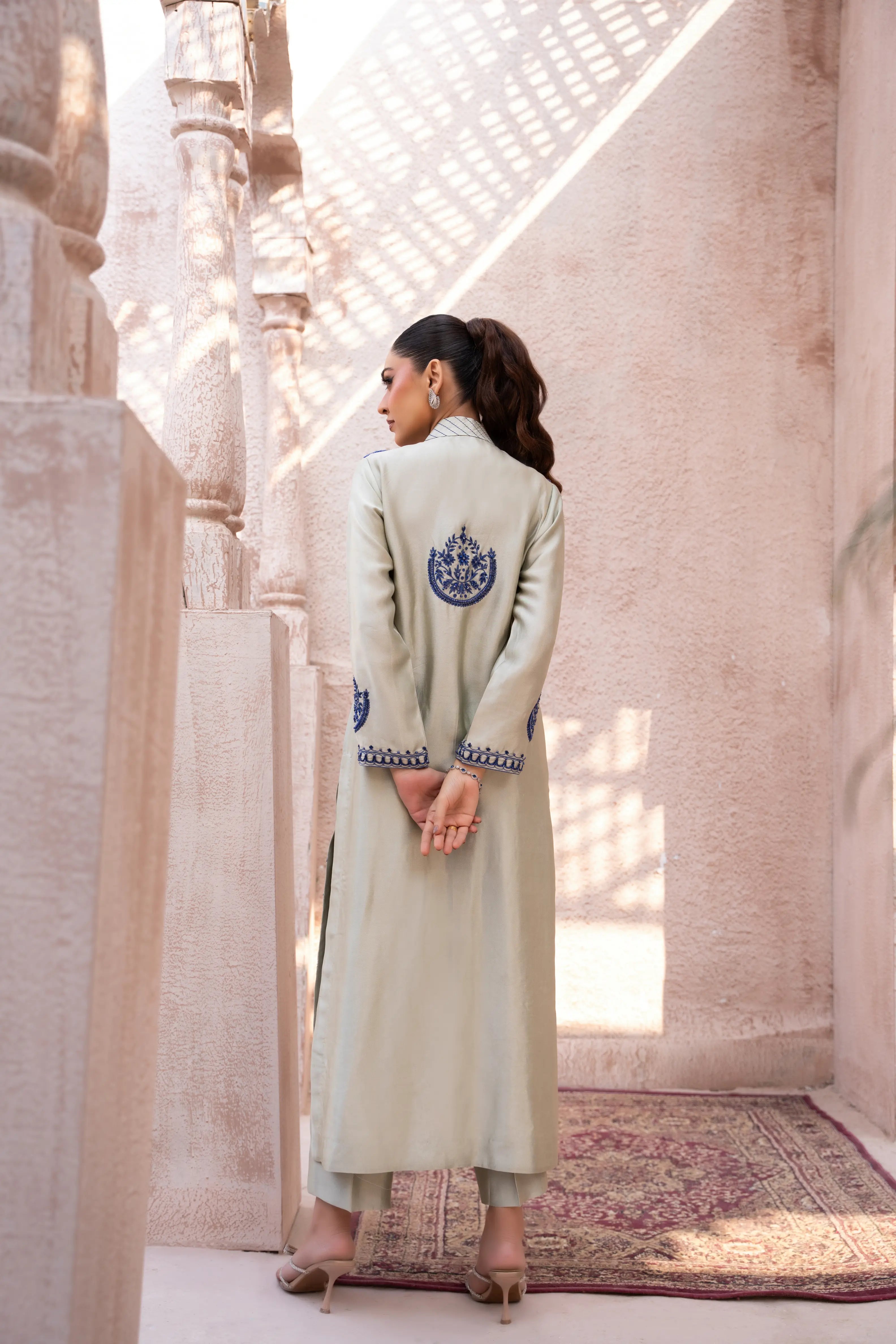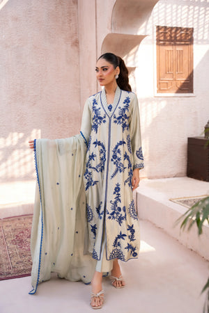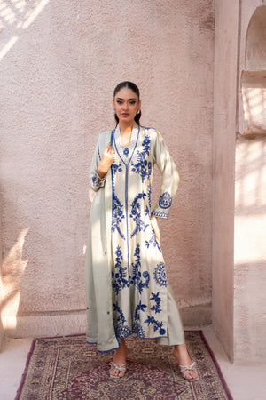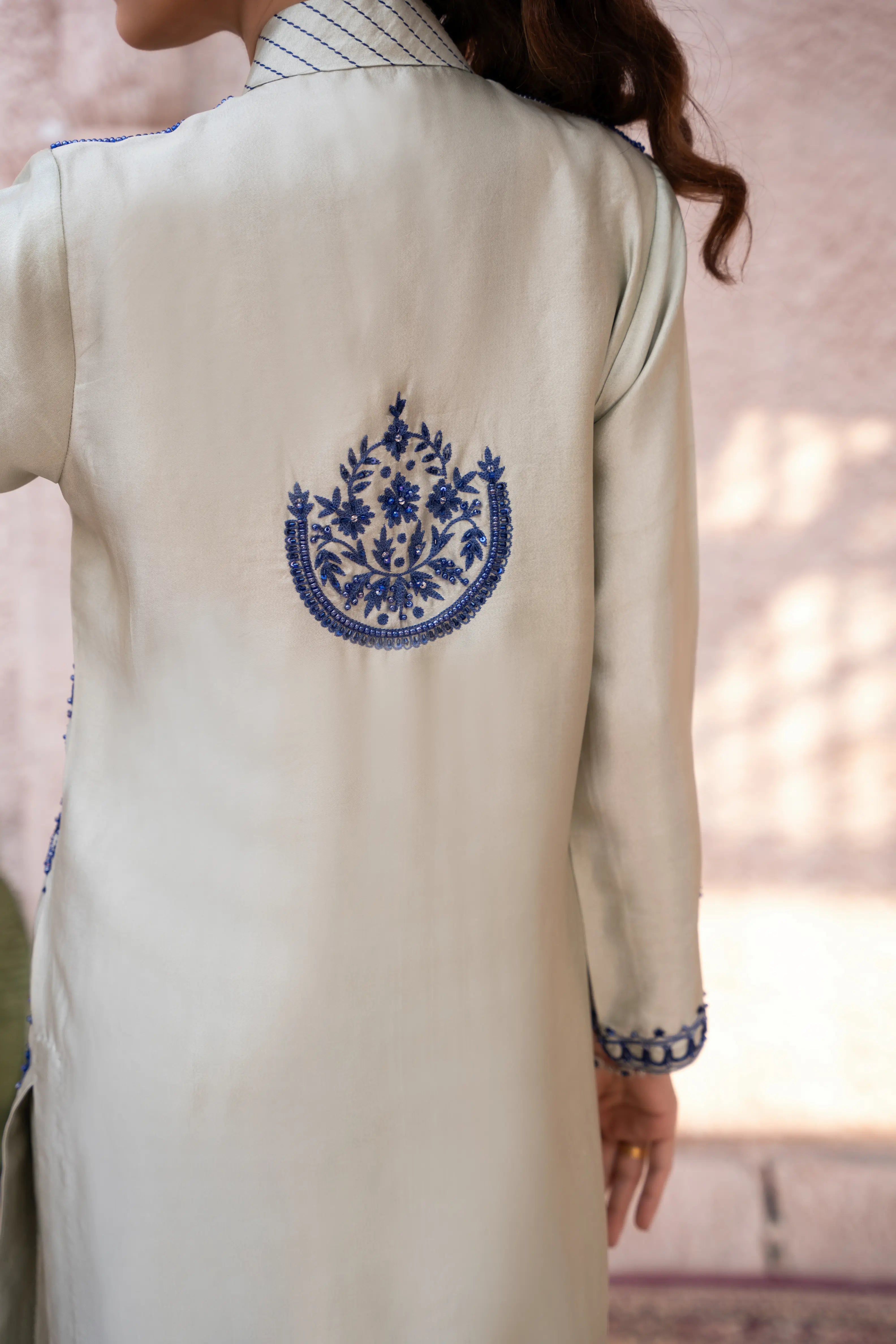 Crafted on luxurious sheesha silk, this graceful ensemble is paired with a medium silk dupatta and features delicate handwork with pearls, cut dana, and fine aari thread embroidery. Thoughtfully detailed for a soft festive shimmer, it’s perfect for serene evenings and joyful celebrations, designed to make you feel happy, confident, and effortlessly elegant.