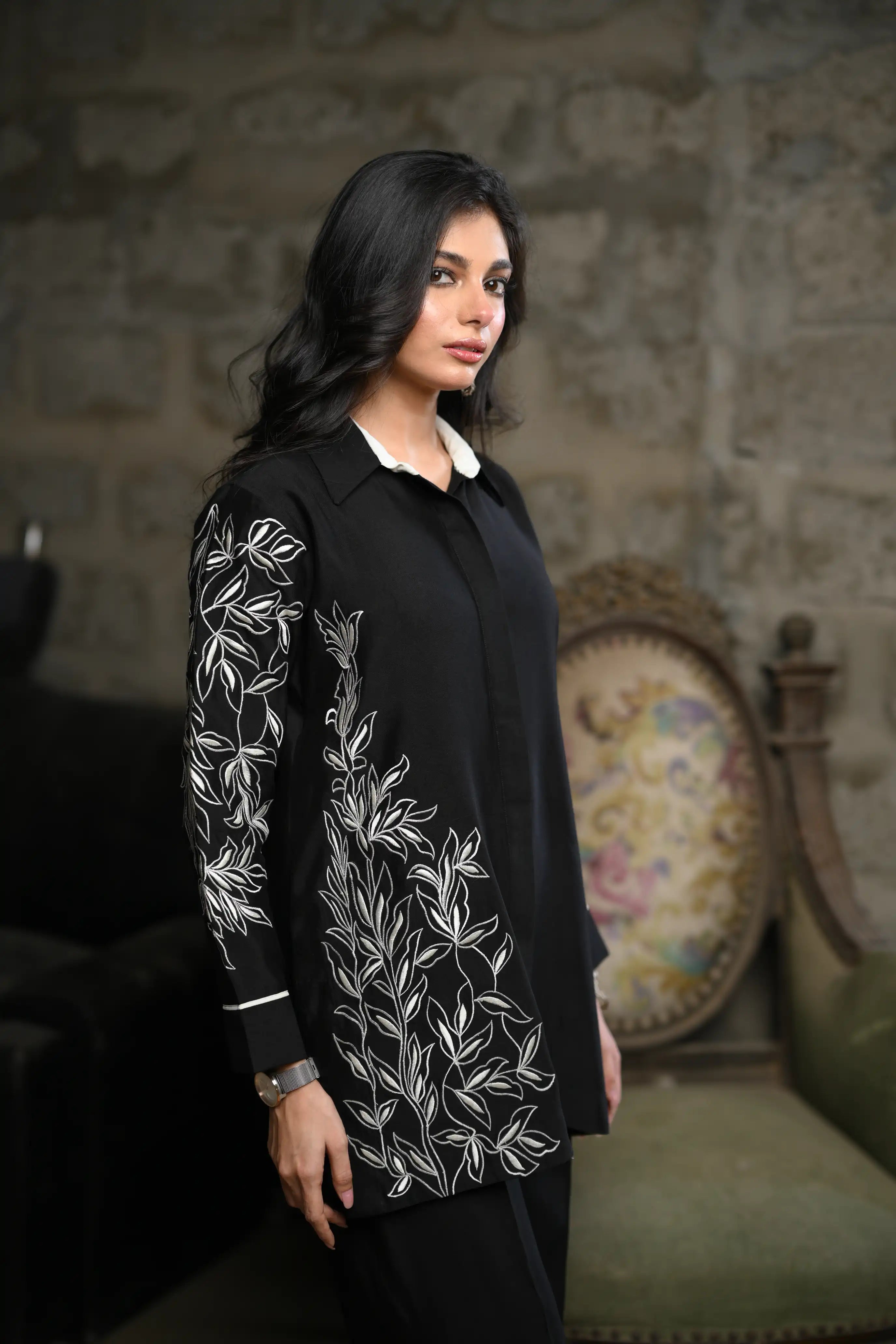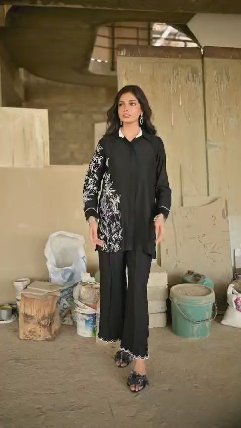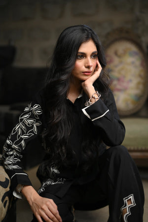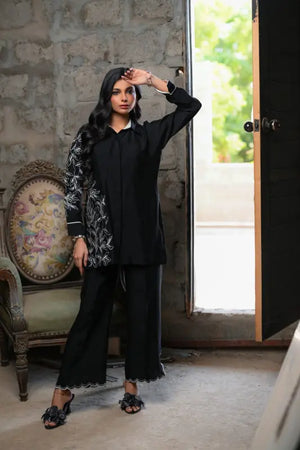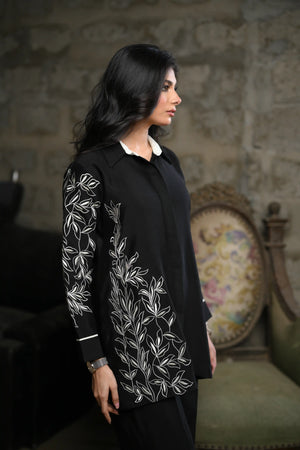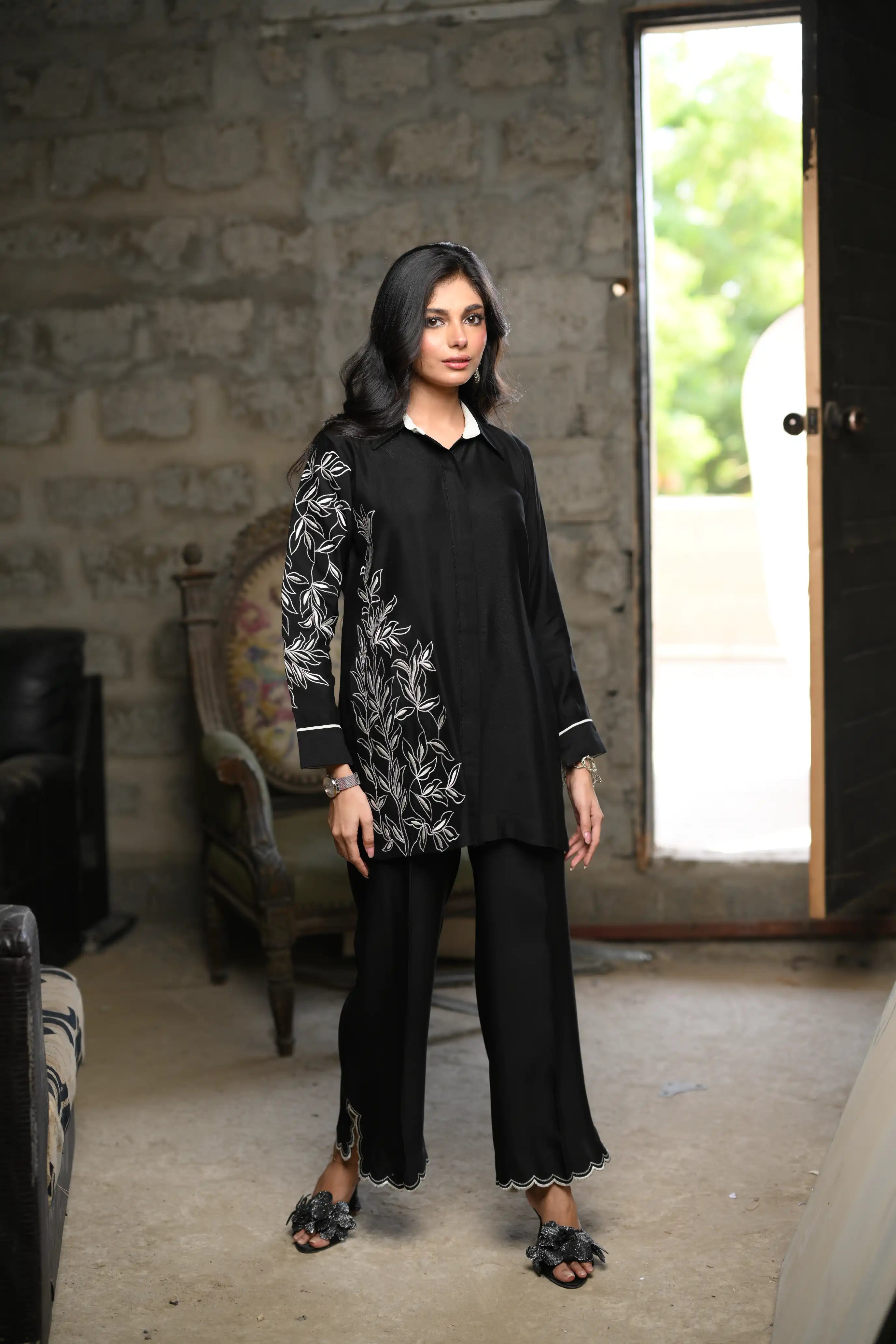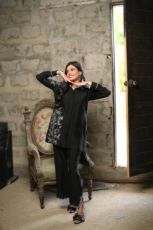 Elevate your lunch or dinner look with a timeless Black and Off-White co-ord set, crafted from luxurious premium georgette fabric. The outfit features a stylish button-down short shirt with a collar, paired with matching straight-legged pants that boast a delicate scalloped hem. Intricate off-white embroidery adorns both pieces, adding a touch of understated elegance. This timeless ensemble seamlessly blends luxury fabric, subtle contrast, and delicate threadwork, elevating your style and making a lasting impression.