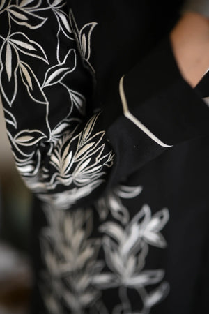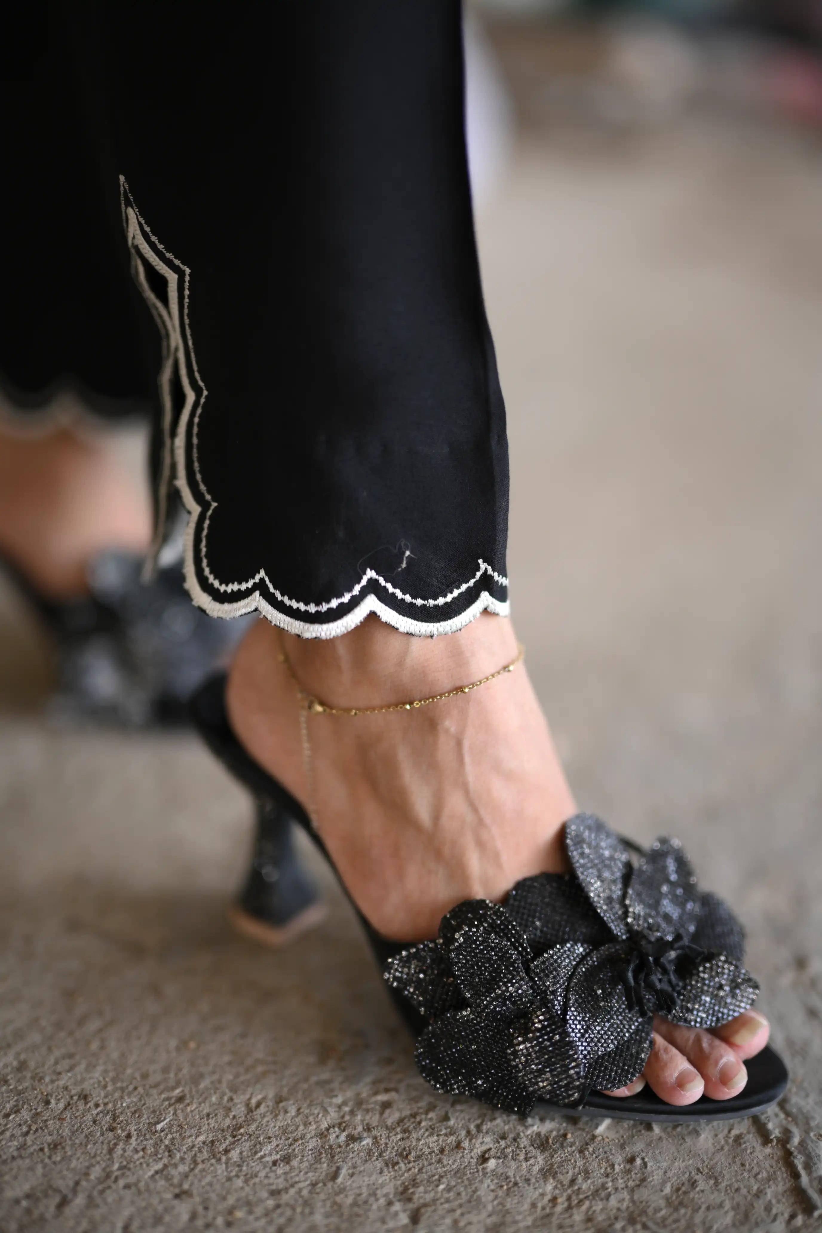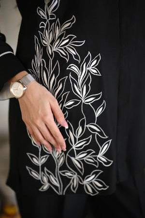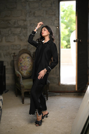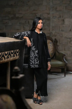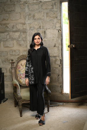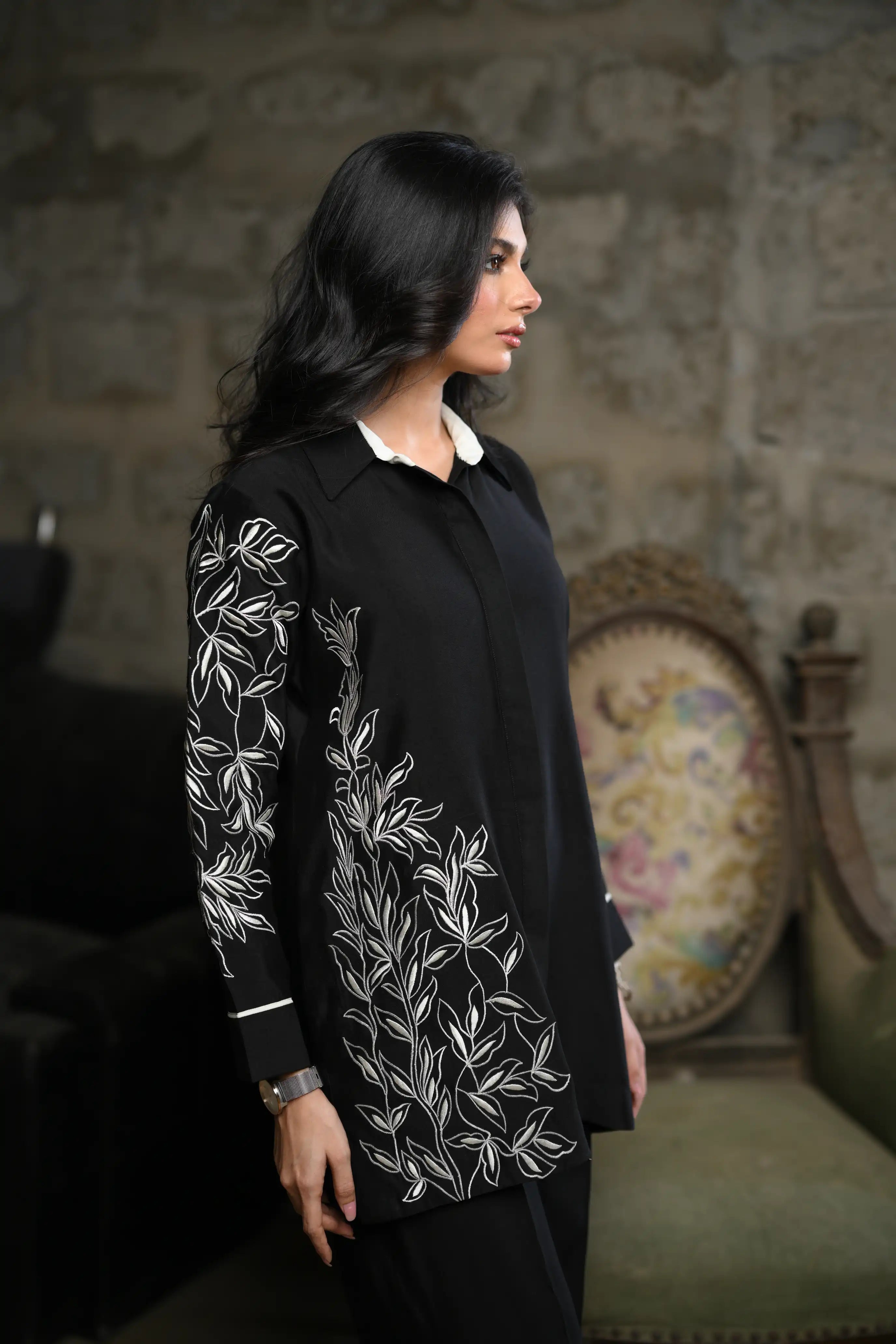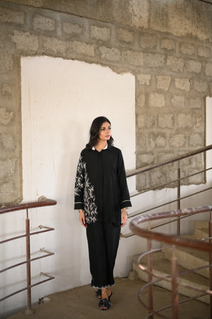 Elevate your lunch or dinner look with a timeless Black and Off-White co-ord set, crafted from luxurious premium georgette fabric. The outfit features a stylish button-down short shirt with a collar, paired with matching straight-legged pants that boast a delicate scalloped hem. Intricate off-white embroidery adorns both pieces, adding a touch of understated elegance. This timeless ensemble seamlessly blends luxury fabric, subtle contrast, and delicate threadwork, elevating your style and making a lasting impression.