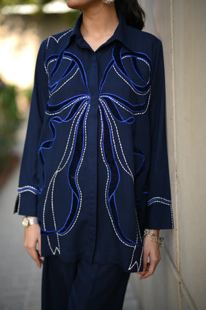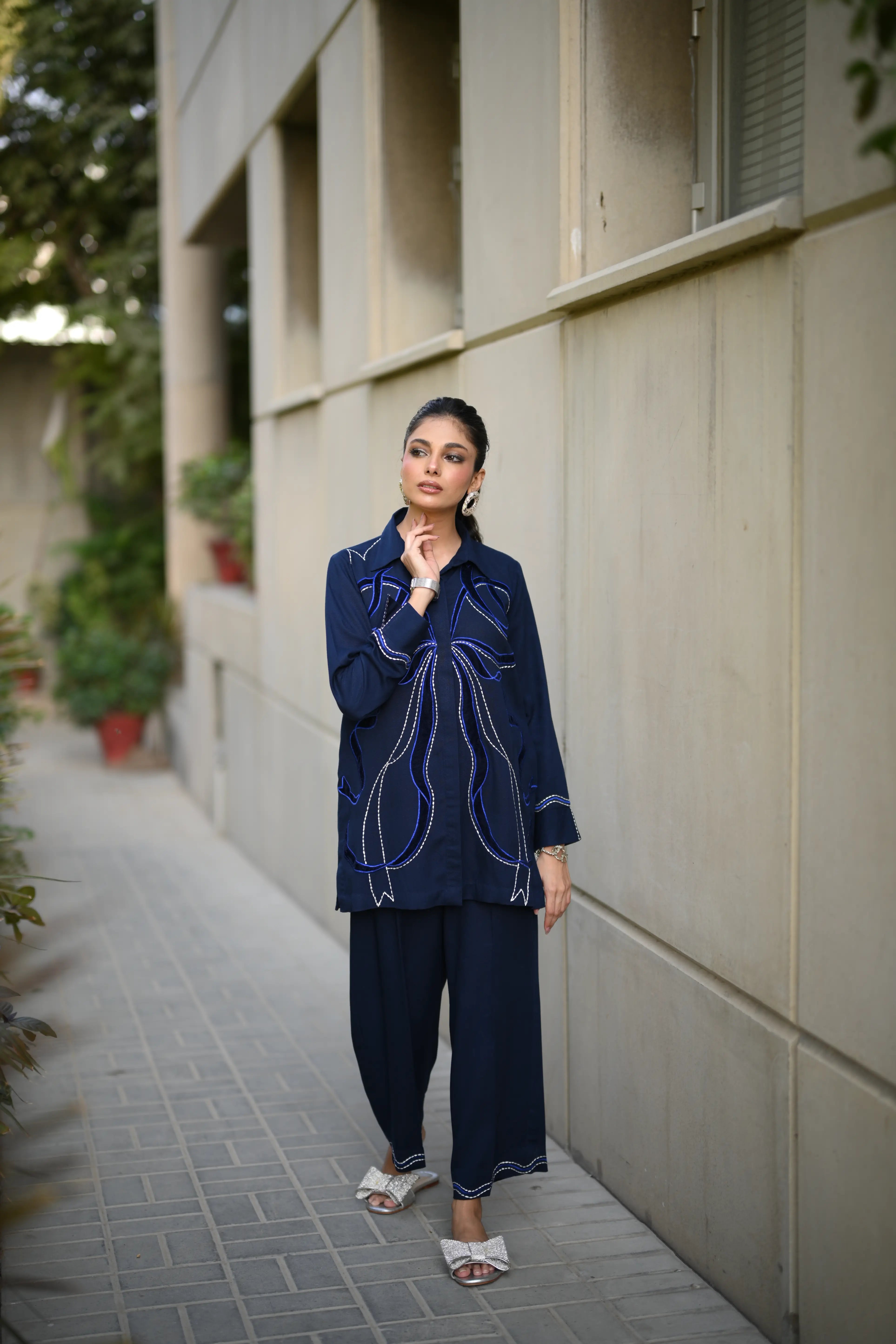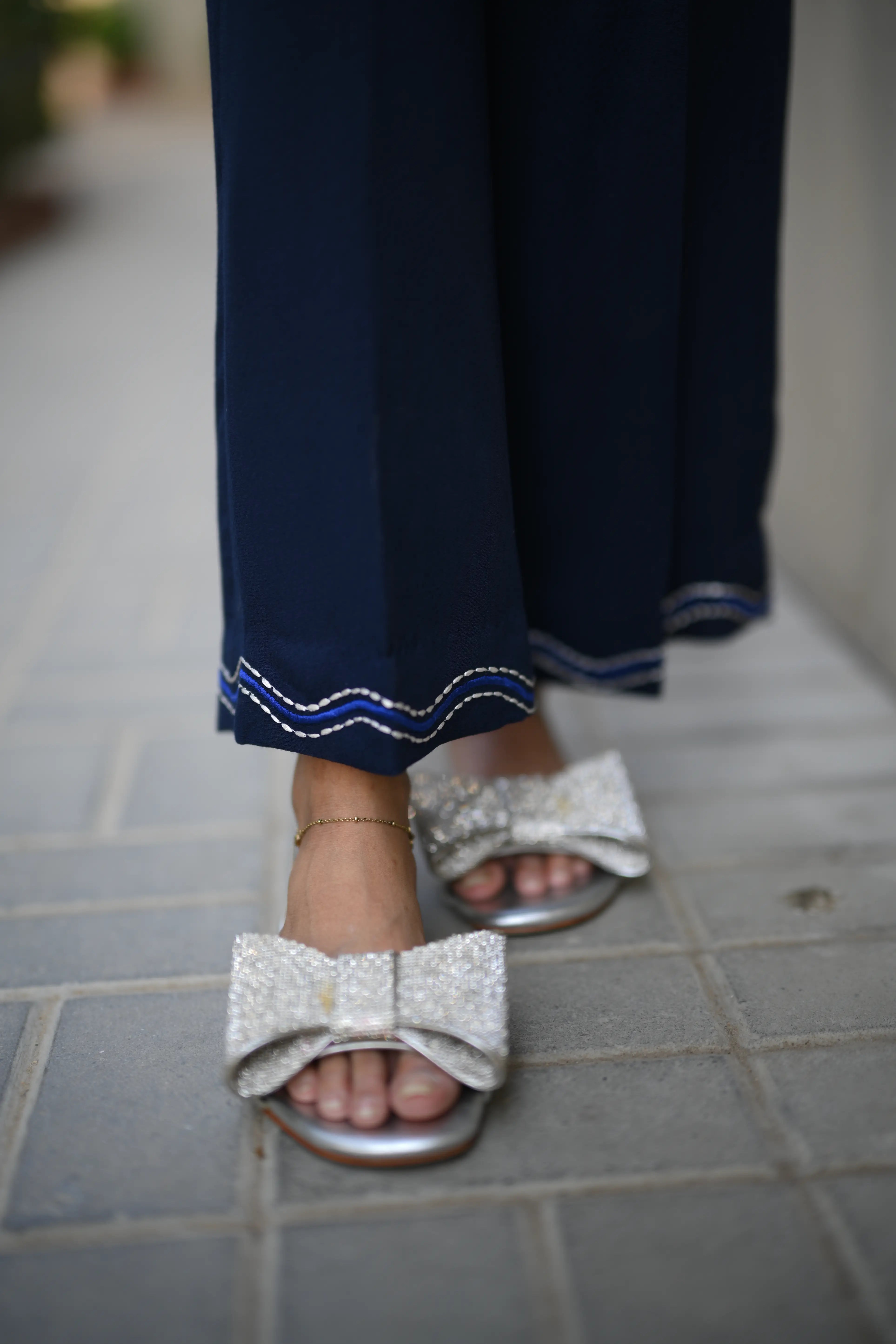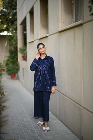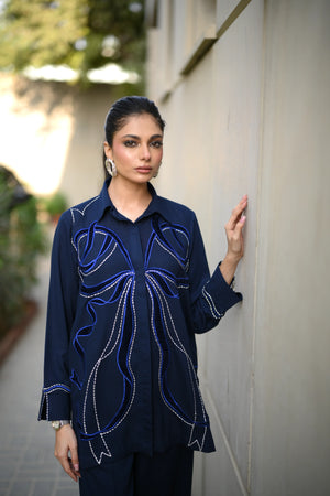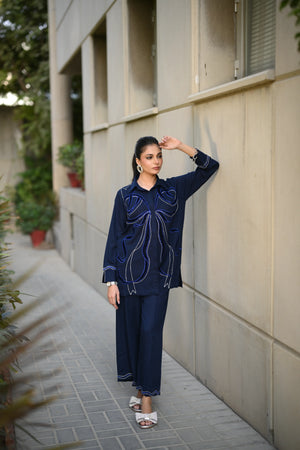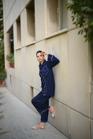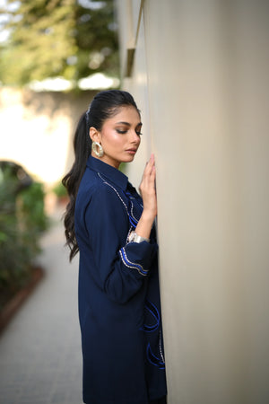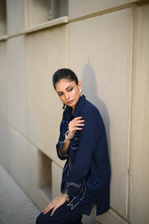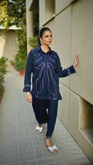 Dress to impress in our majestic navy blue outfit, adorned with sumptuous velvet appliqué and exquisite embroidery featuring delicate Chawal Taanka and elegant bow patterns.The outfit is complete with beautifully embroidered pants and cuffs, adding a sophisticated finish to this stunning ensemble. Perfect for special occasions, this refined outfit embodies poise and elegance, ensuring you make a lasting impression.