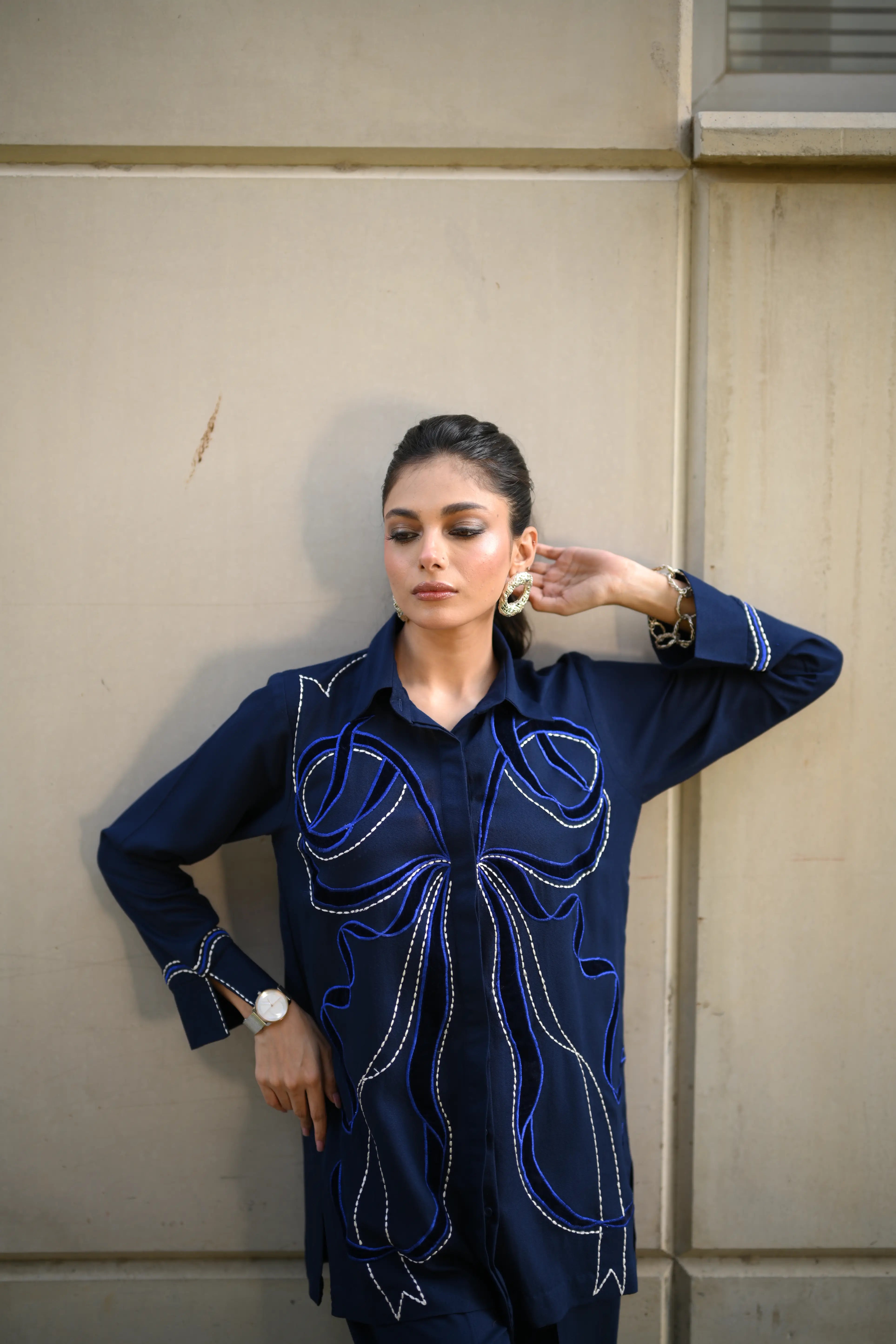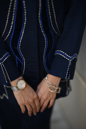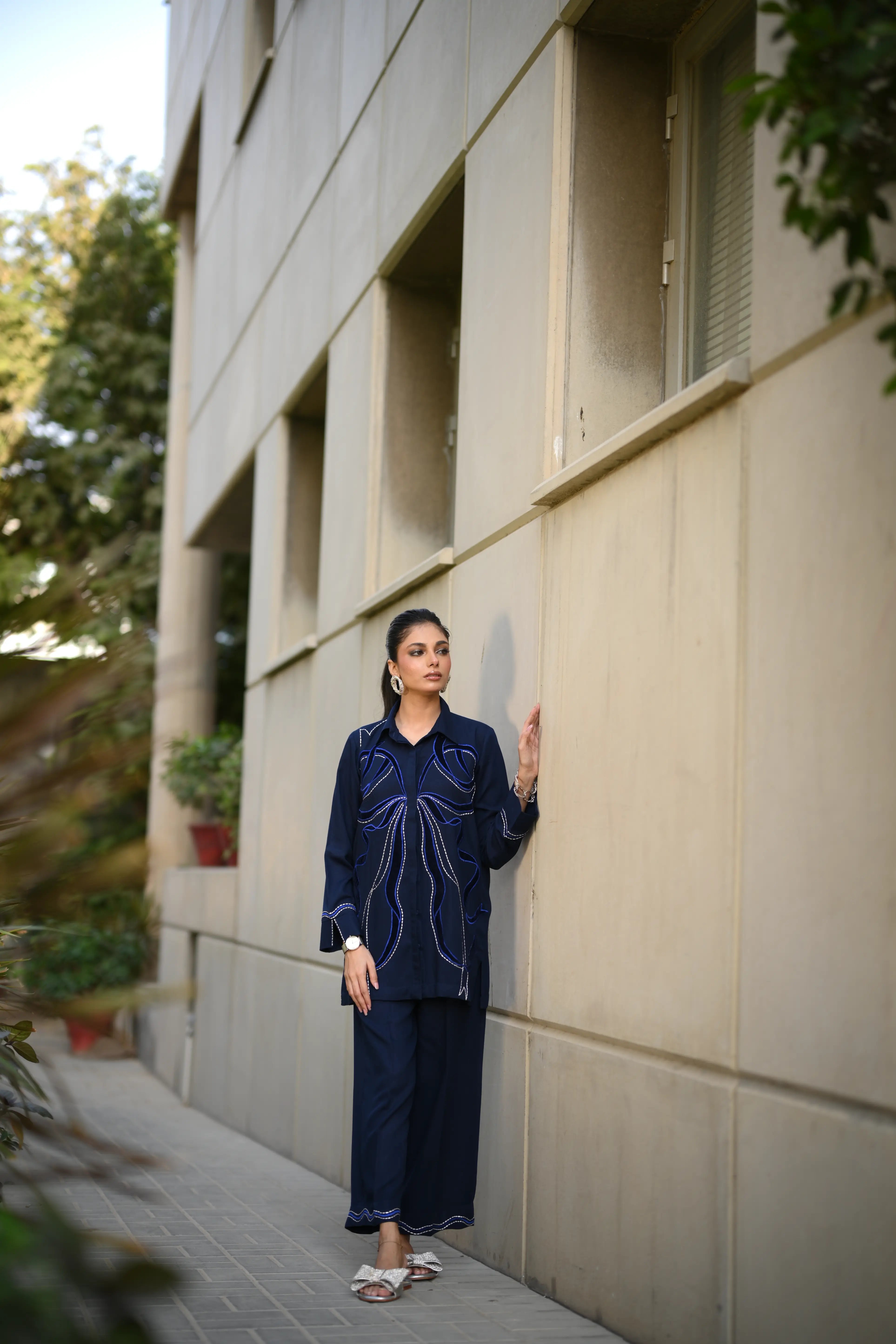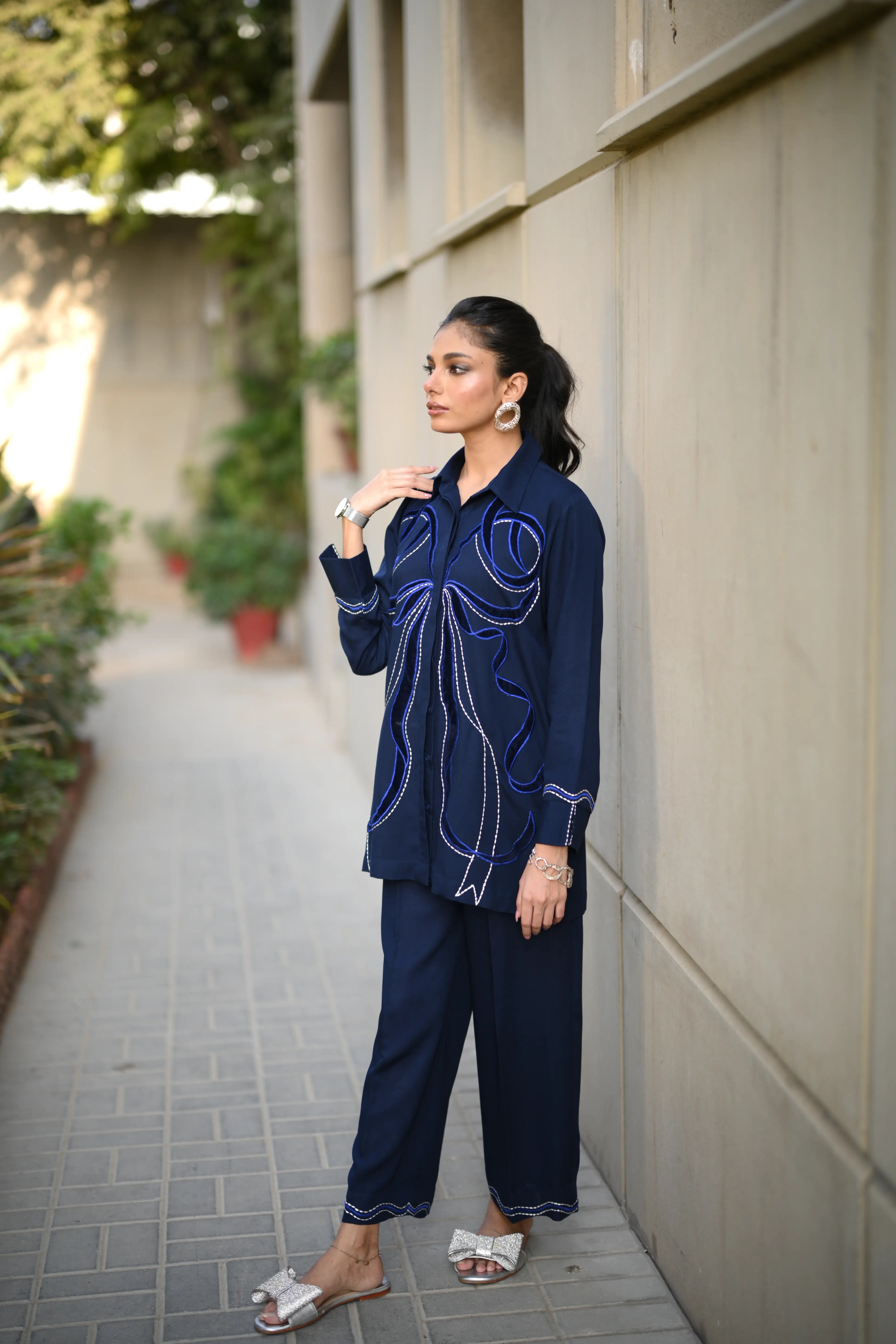Dress to impress in our majestic navy blue outfit, adorned with sumptuous velvet appliqué and exquisite embroidery featuring delicate Chawal Taanka and elegant bow patterns.The outfit is complete with beautifully embroidered pants and cuffs, adding a sophisticated finish to this stunning ensemble. Perfect for special occasions, this refined outfit embodies poise and elegance, ensuring you make a lasting impression.