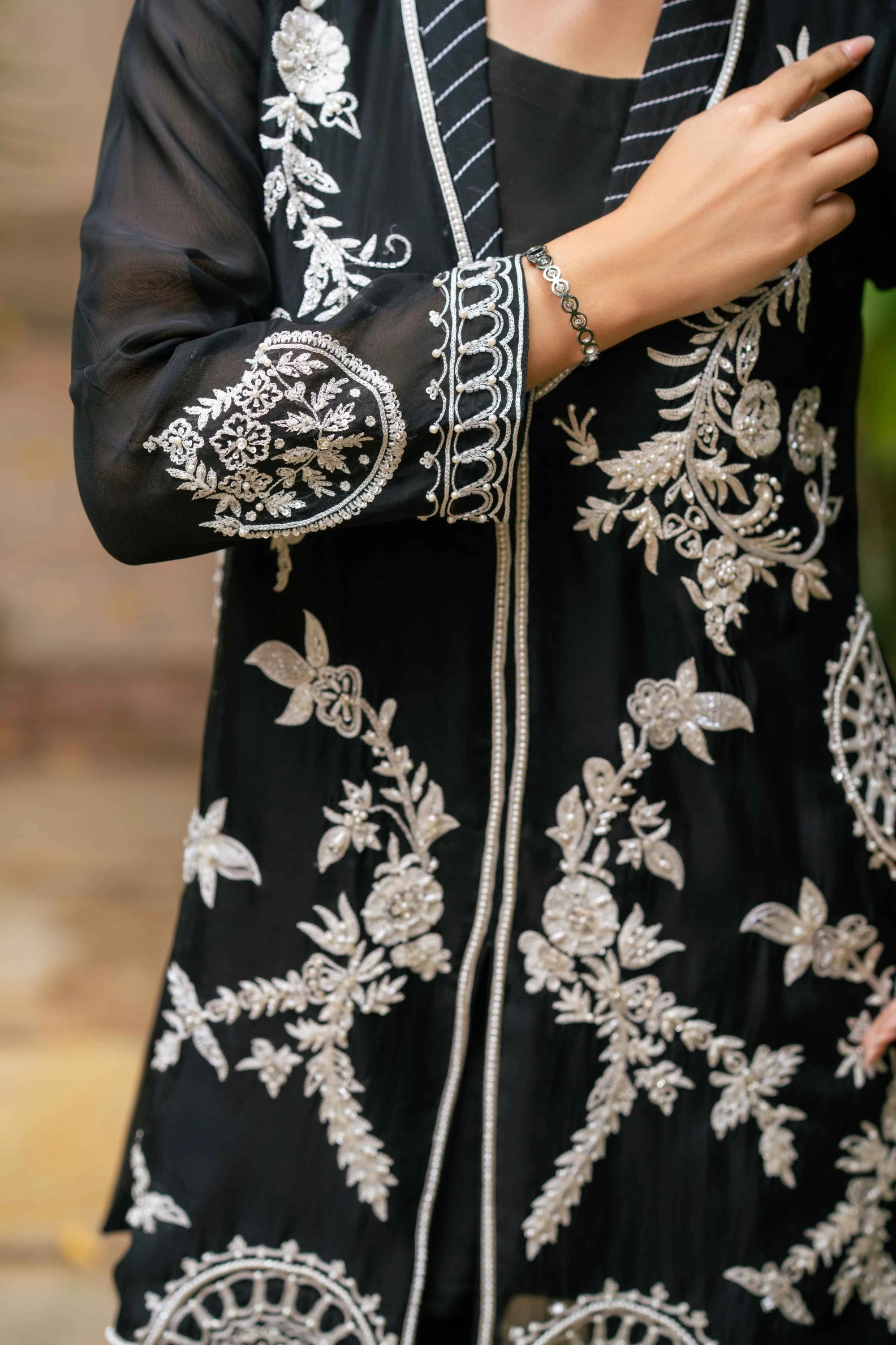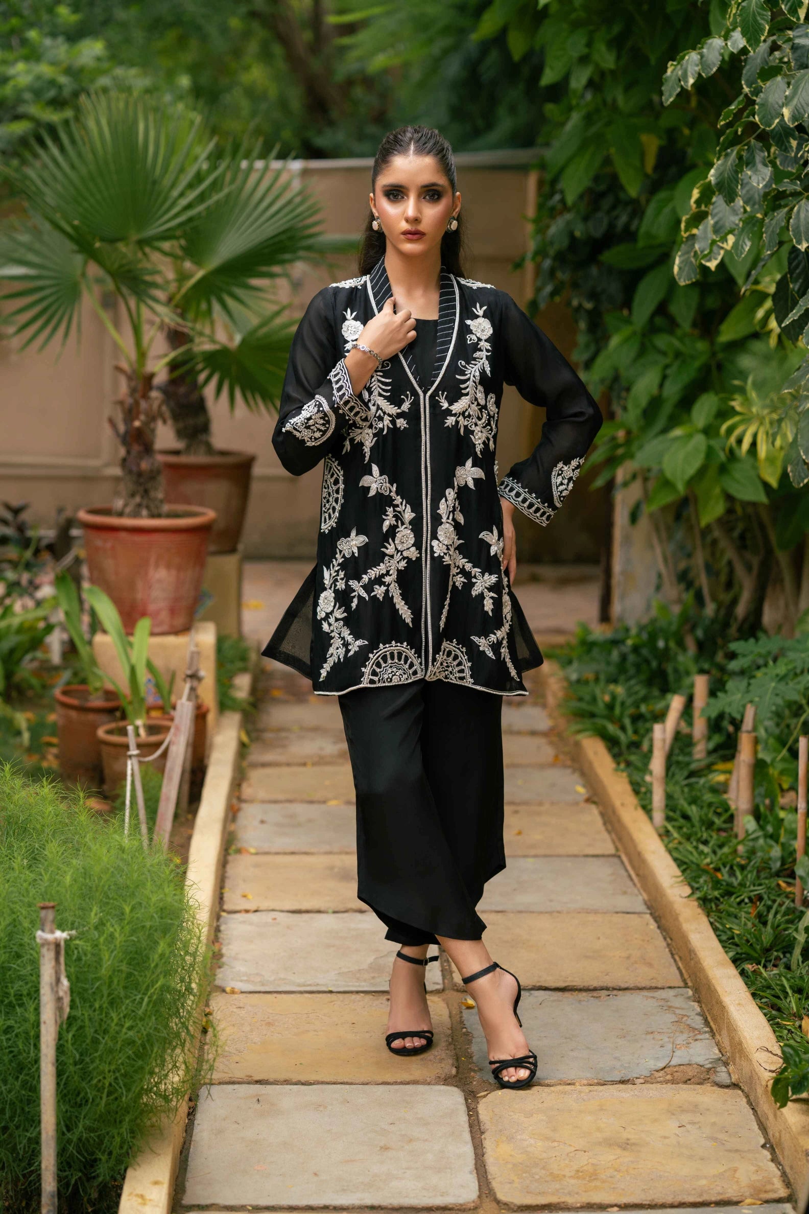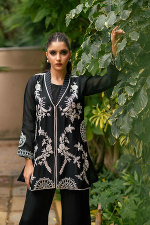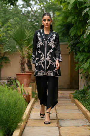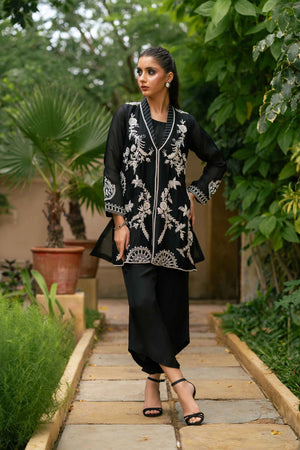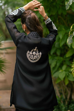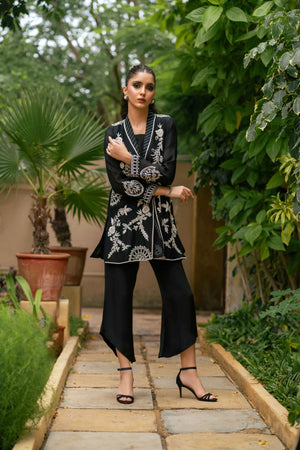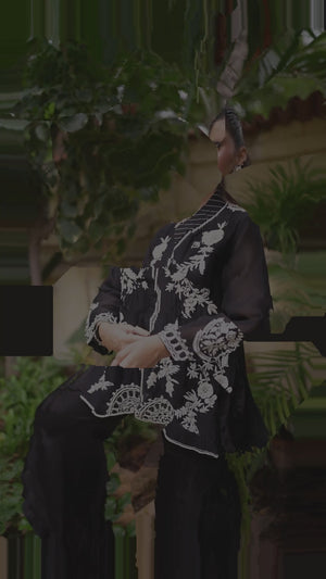 An elegant pure kathan organza shirt in classic black, beautifully enhanced with white resham embroidery, pearls, cutdana, and sequins. The intricate floral motifs flow across the front and sleeves, while delicate back detailing adds an extra touch of refinement. Paired with asymmetrical black pants in Russian silk, the ensemble blends modern cuts with timeless embroidery, making it a versatile choice for dinners, formal gatherings, and evening occasions.