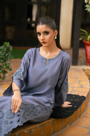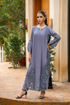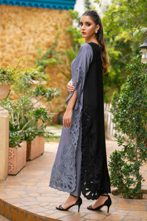 Ember — An exquisite statement in pure khaadi silk, this grey and black ensemble embodies refined craftsmanship. The front in elegant grey contrasts strikingly with a deep black back, creating a bold play of tones. Delicate cutwork and shimmering cutdana embellishments flow seamlessly across the long slit that runs till the hem, adding depth and sparkle. The straight pants maintain a sleek silhouette, while the intricately detailed sleeves complete the look with finesse.