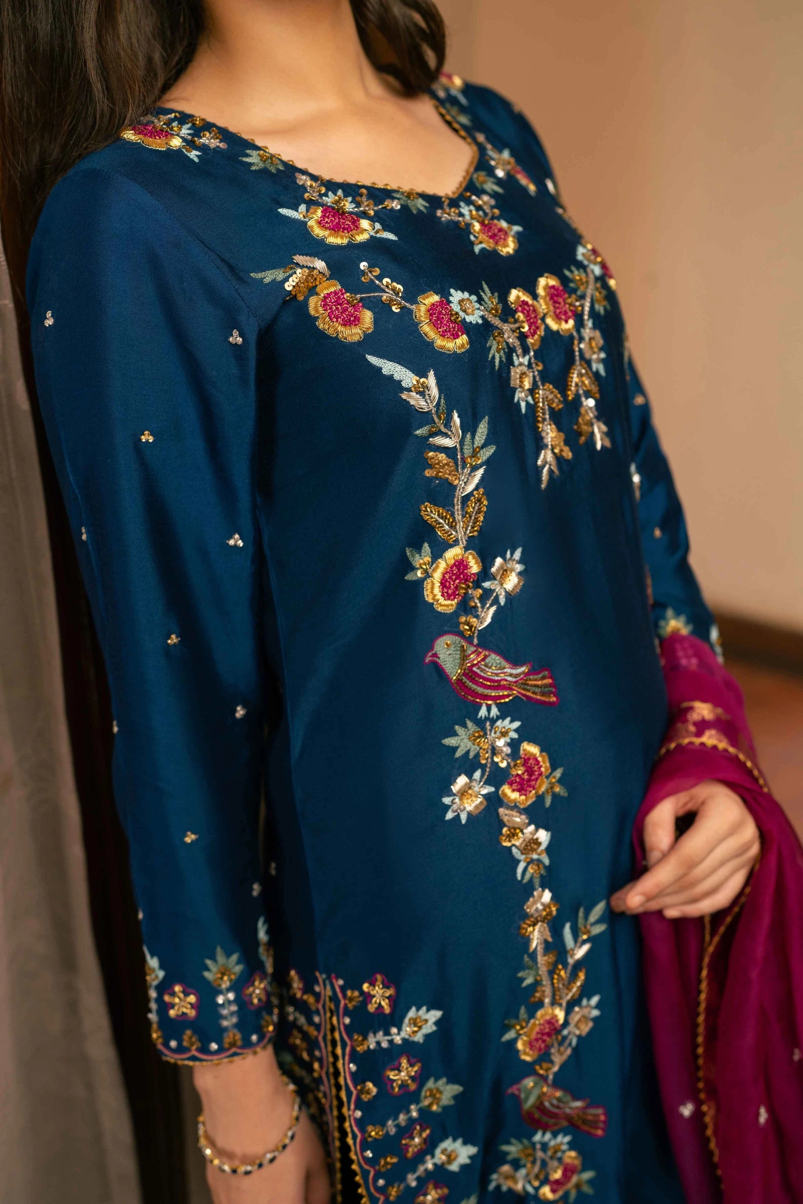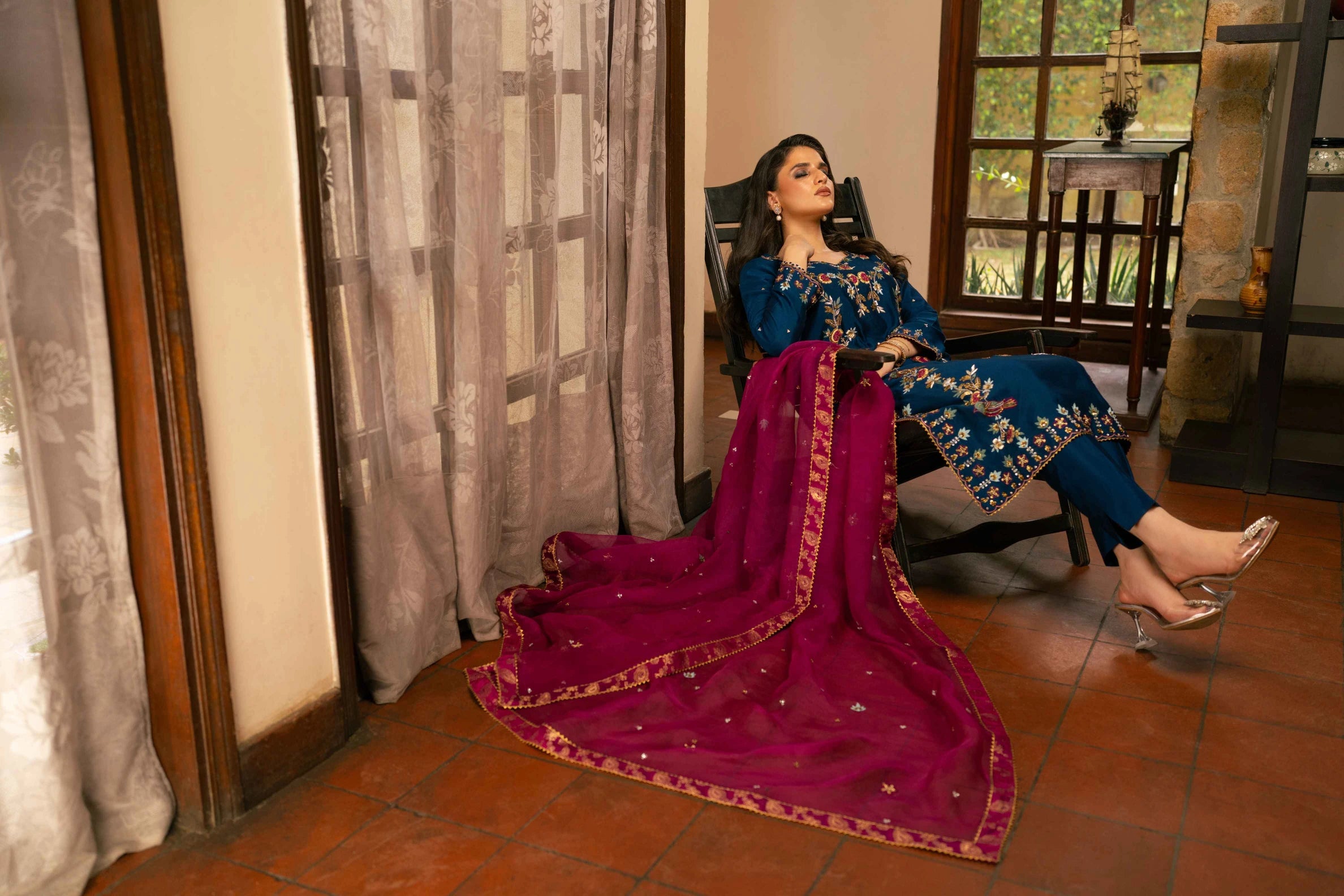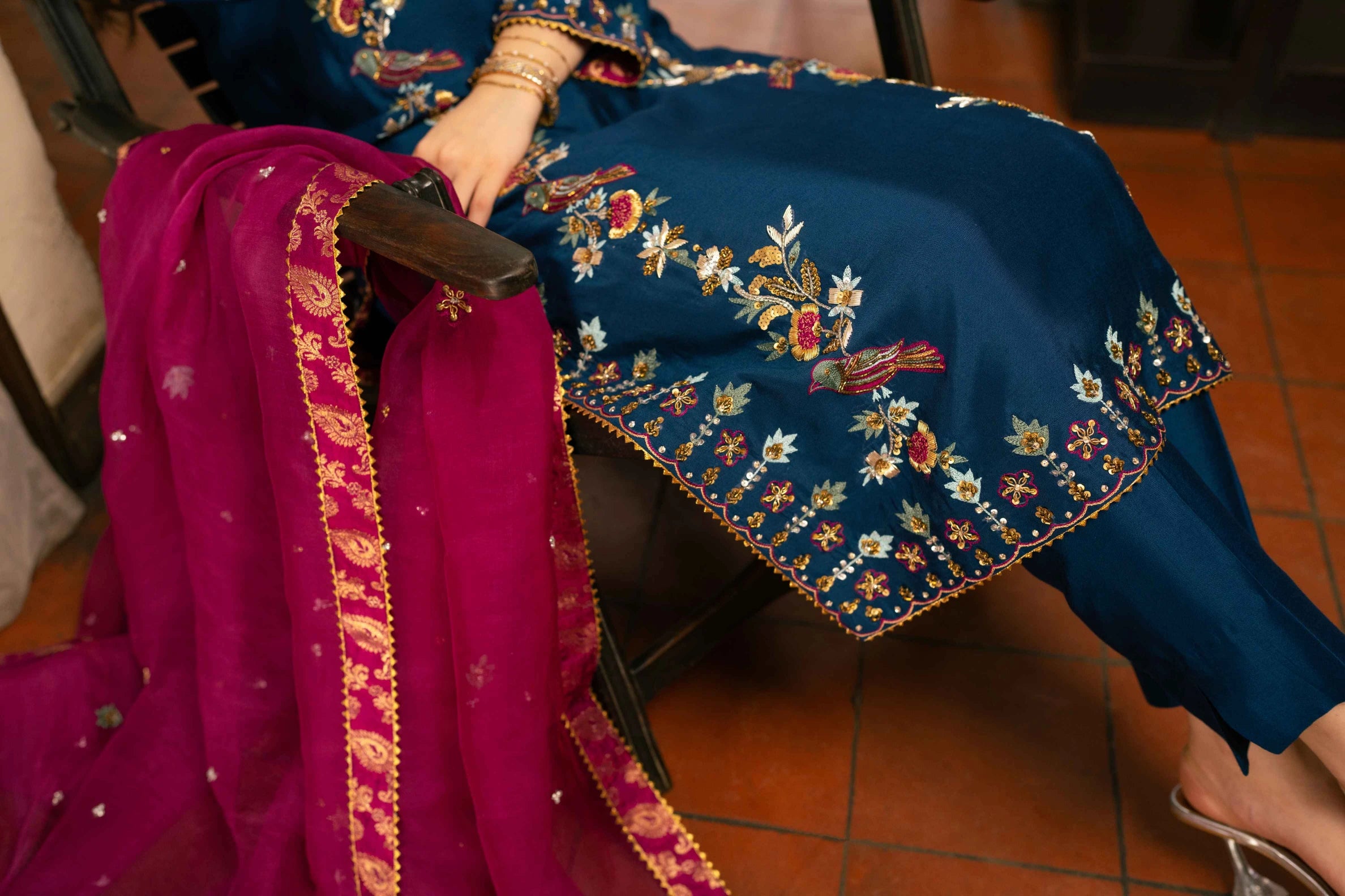 Mahgul — A graceful three-piece blue khaadi silk suit, paired with a vibrant pure magenta organza dupatta, inspired by the charm of blooming gardens and the elegance of birds. The outfit is adorned with exquisite zardozi, resham, cutdana, and sequins embroidery, with detailed work at the daman and hemline that continues beautifully at the back. A statement of timeless artistry, perfect for formal occasions and wedding festivities.