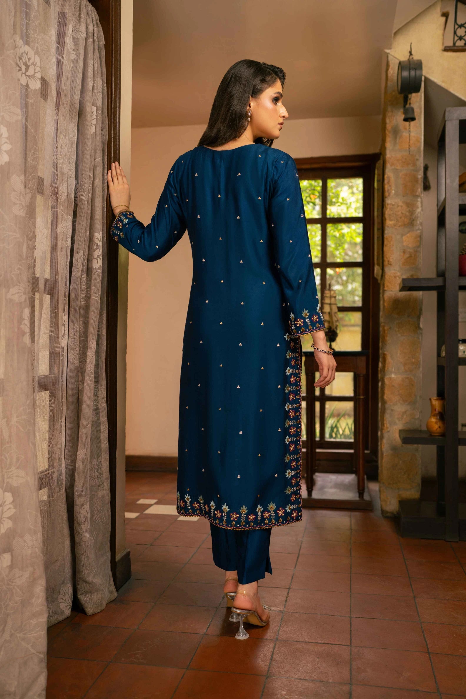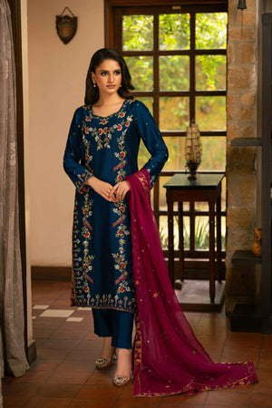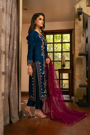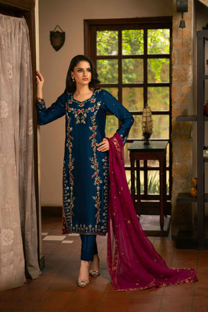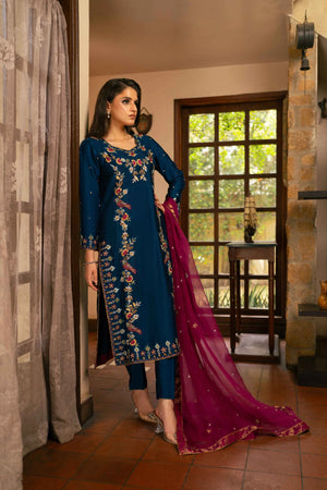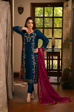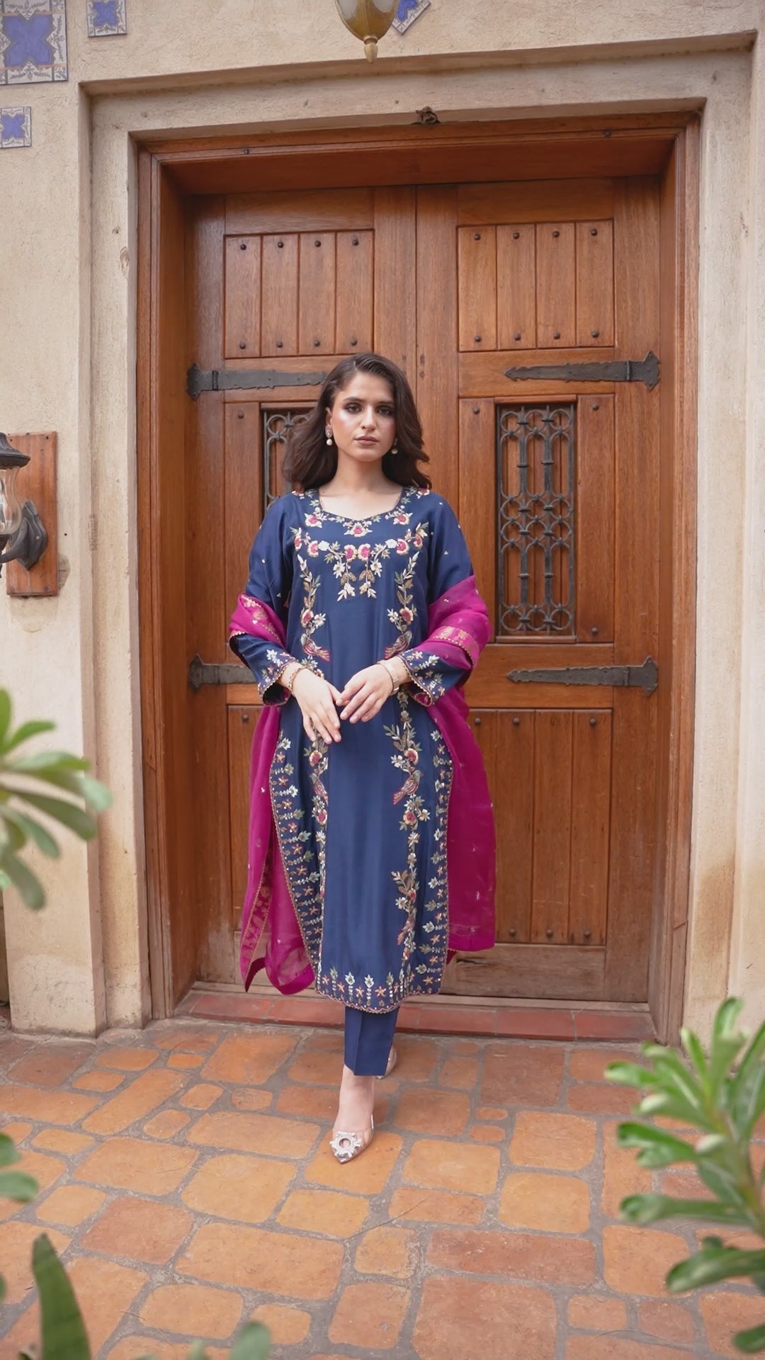 Mahgul — A graceful three-piece blue khaadi silk suit, paired with a vibrant pure magenta organza dupatta, inspired by the charm of blooming gardens and the elegance of birds. The outfit is adorned with exquisite zardozi, resham, cutdana, and sequins embroidery, with detailed work at the daman and hemline that continues beautifully at the back. A statement of timeless artistry, perfect for formal occasions and wedding festivities.