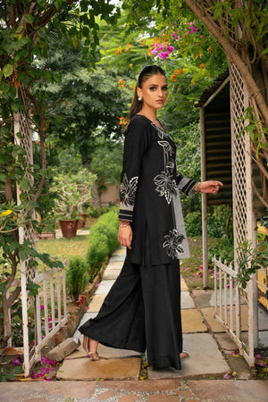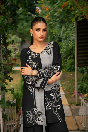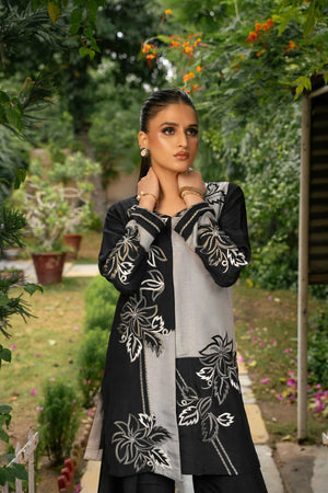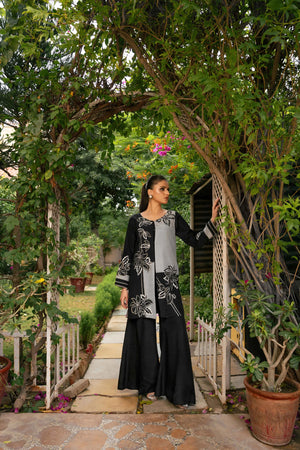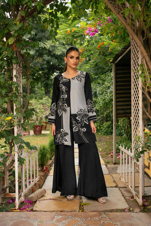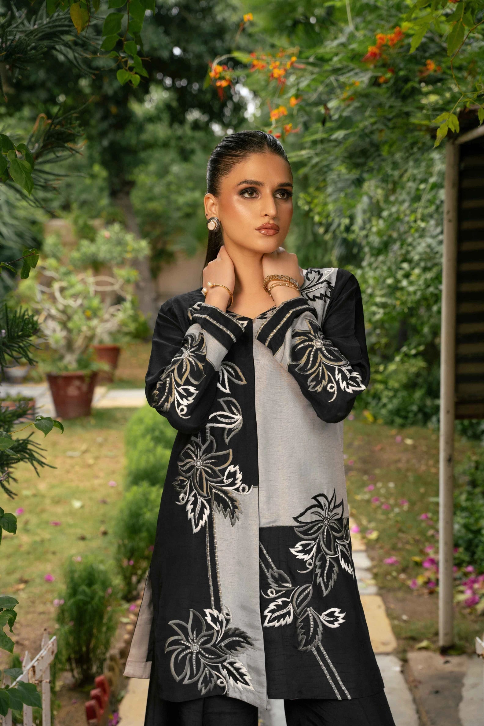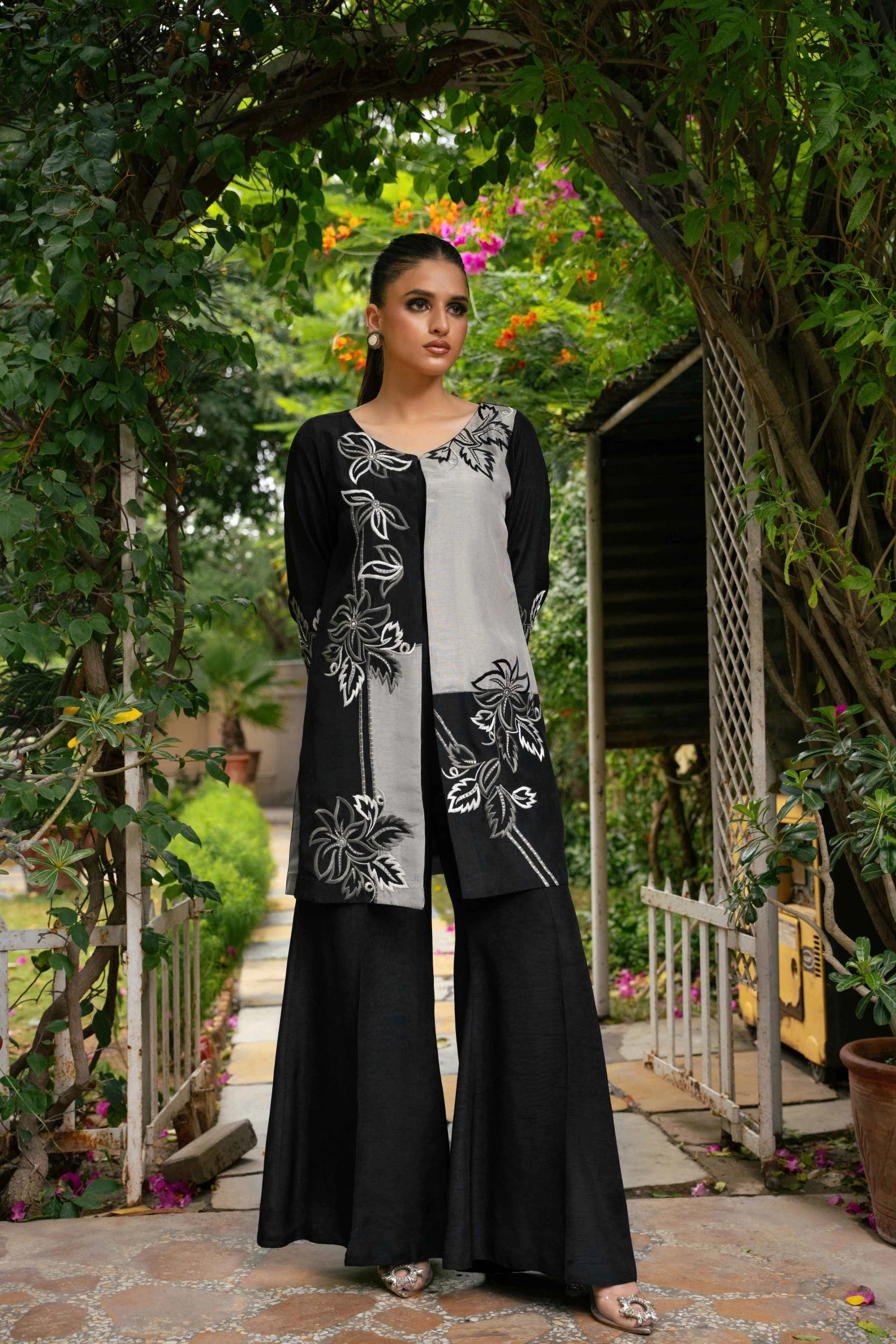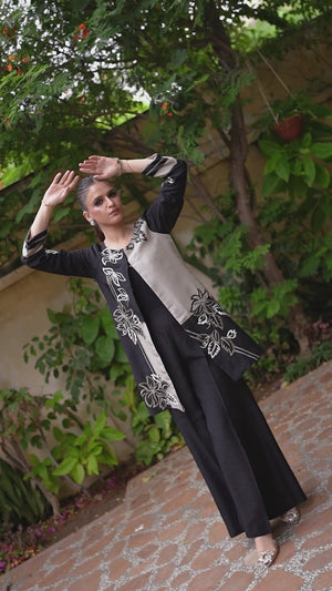 Nova — An effortless fusion of modern silhouette and timeless craftsmanship, Nova redefines contemporary elegance. The pure Korean silk jacket is rendered in a striking palette of black and silver, designed with a bold colour-block effect that instantly captivates. Intricate floral motifs, embroidered in resham and zari, cascade gracefully across the jacket, adding depth and artisanal beauty. A sleek black slip layers beneath, while fluid, loose draped pants enhance the effortless flow of the silhouette.