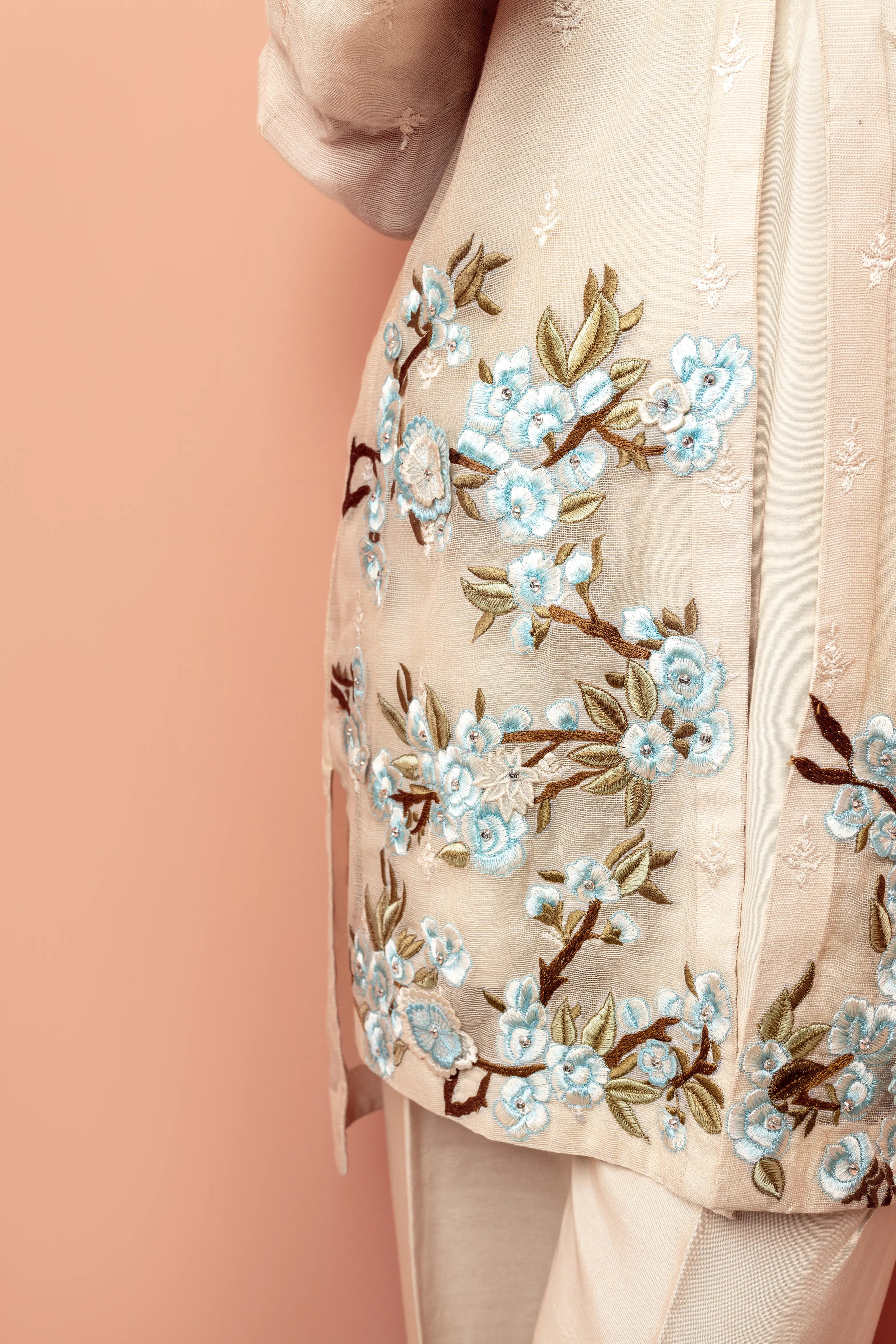 This exquisite Khaddi net set comprises a cape, slip, and trousers, with the cape showcasing a delicate embroidered pattern adorned with 3D flowers, intricate cutwork, and a sprinkle of pearls and diamantés. Adding a pop of colour, the trousers and sleeve cuffs feature stunning blue aari work, elevating this ensemble to new heights of sophistication and glamour.