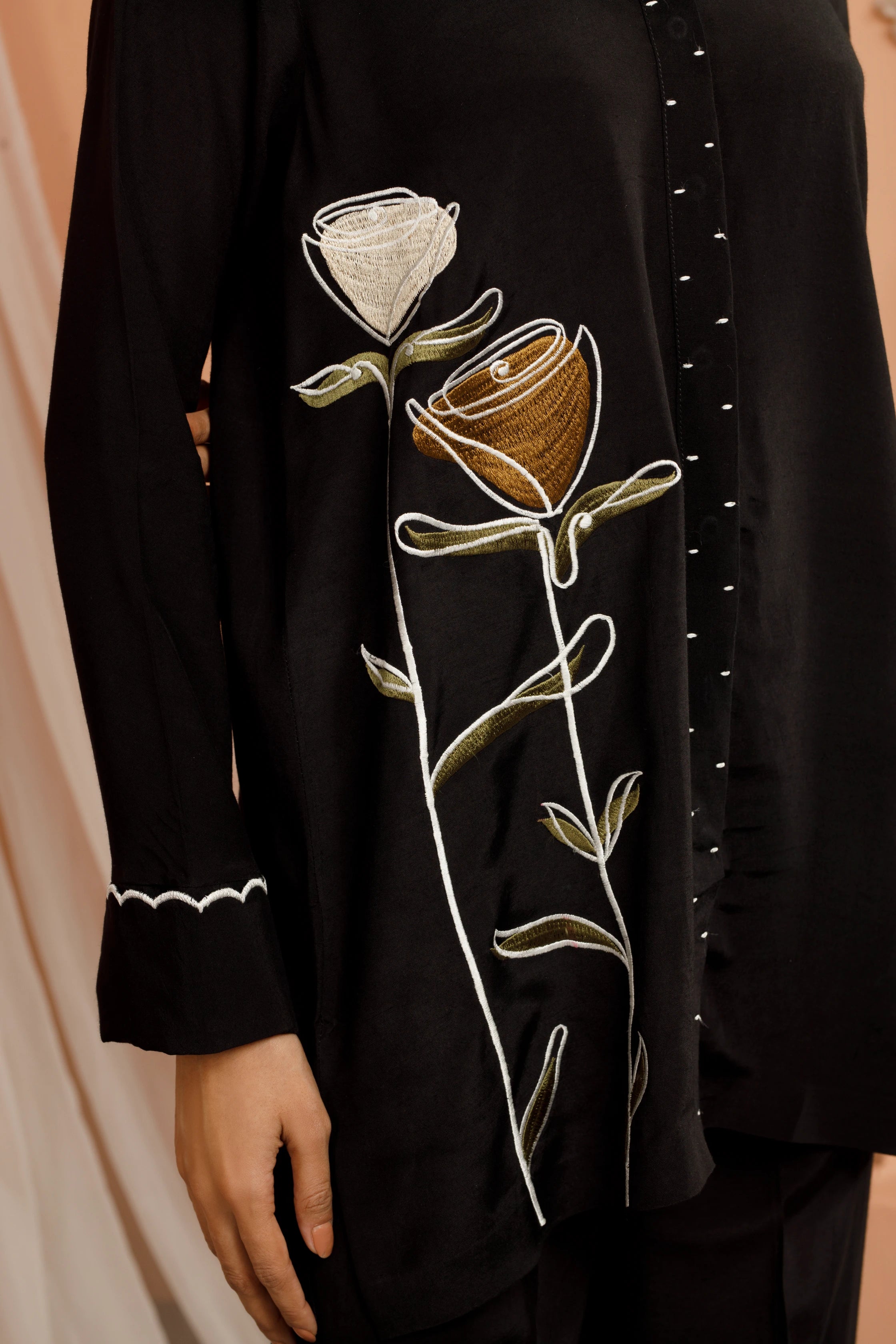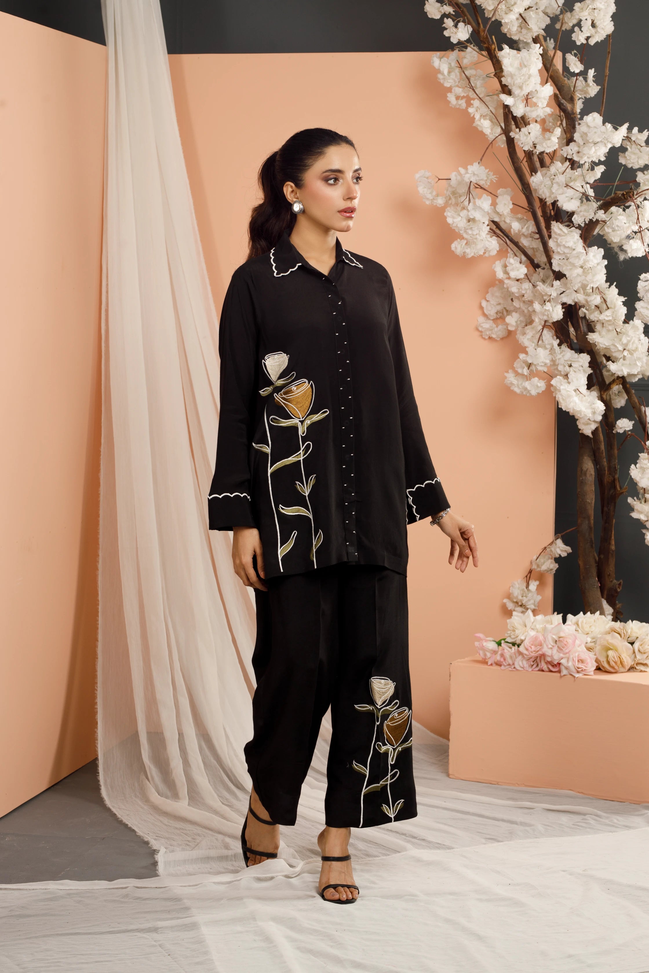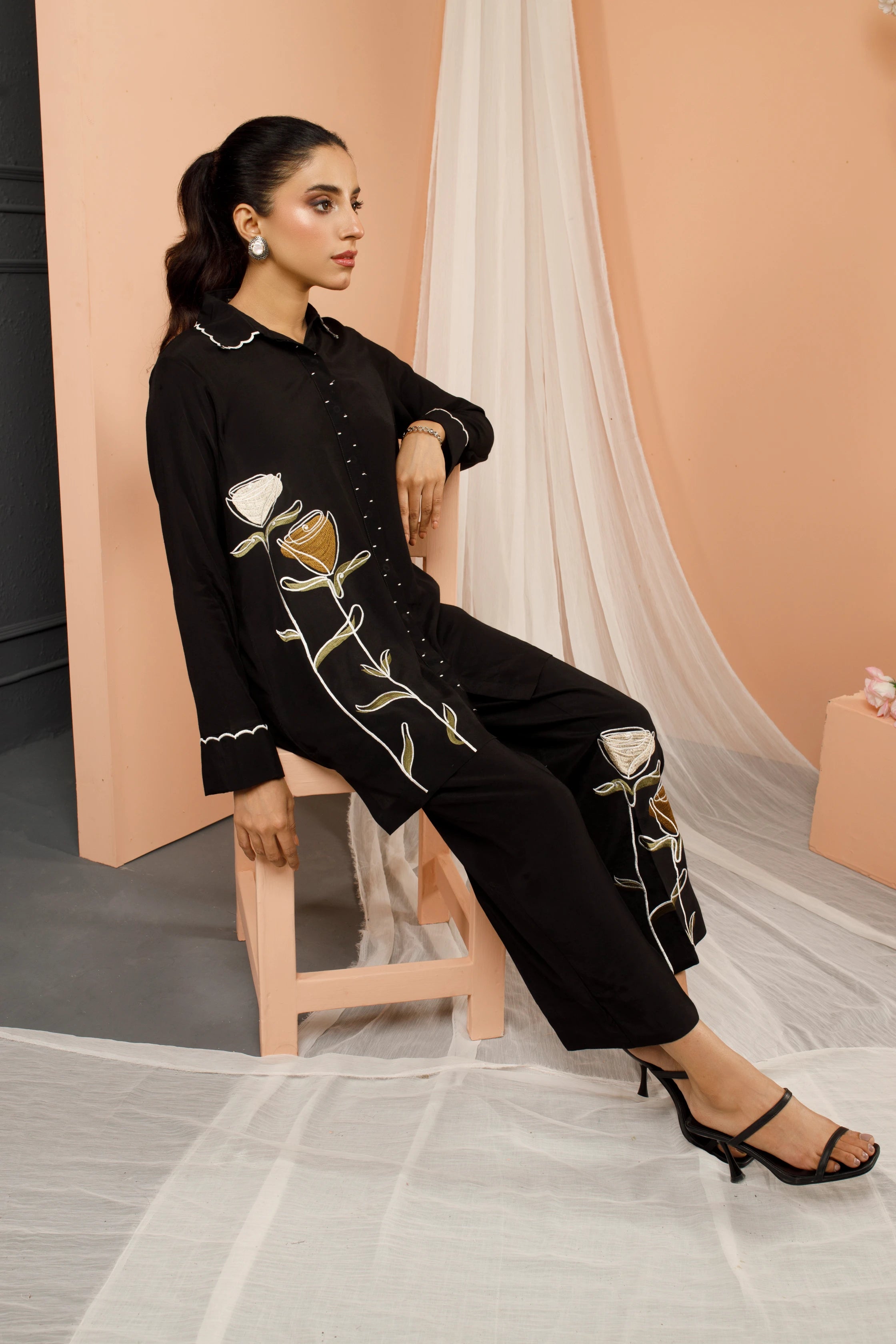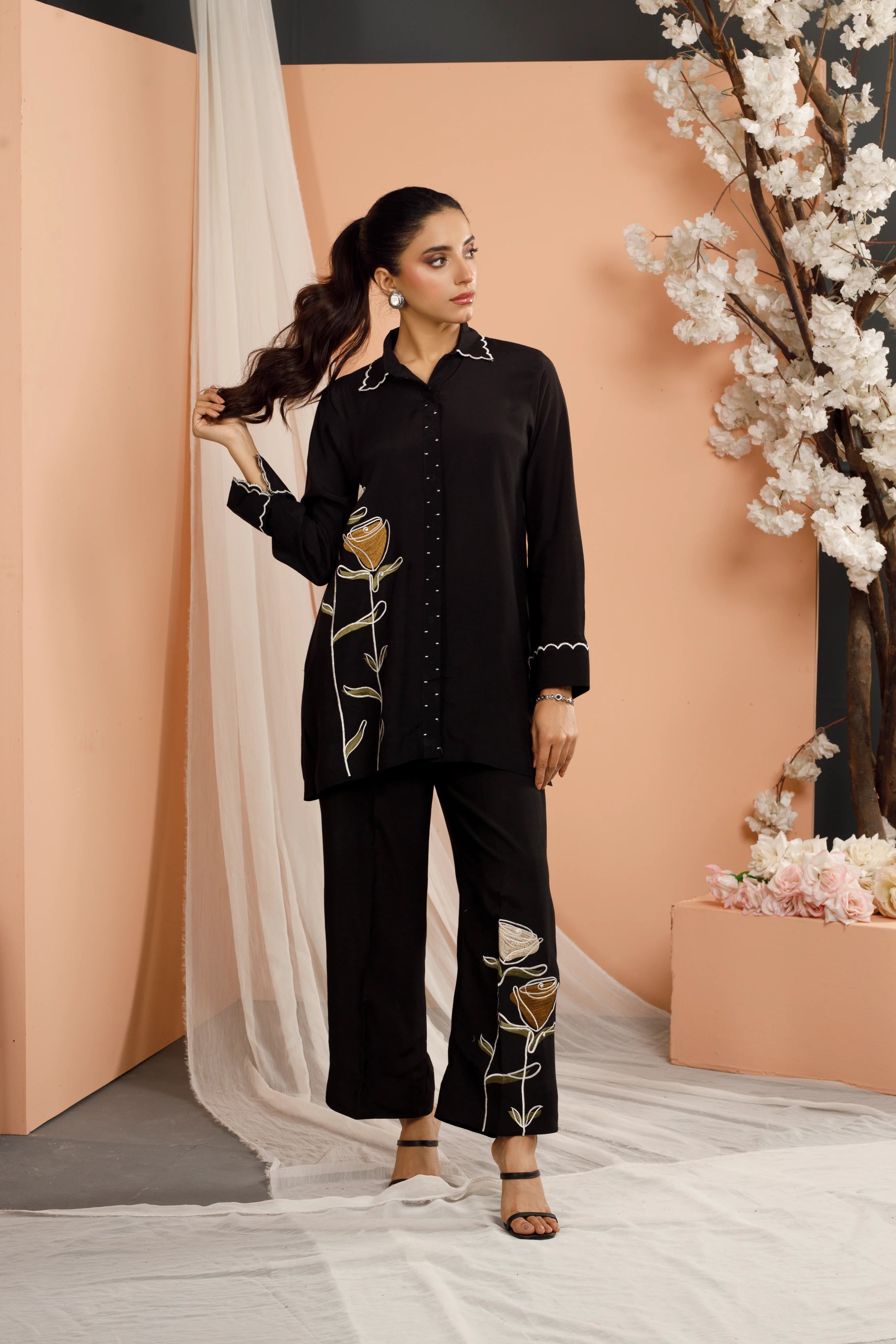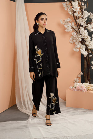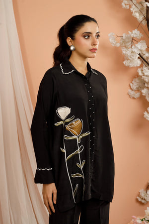 Adorned with intricately crafted floral patterns on lightweight, breathable fabric, this elegant dress is perfectly paired with matching embroidered pants that boast a modern, trendy flair. To add an extra layer of sophistication, the sleeves feature intricate Chawal Tanka embroidery on the cuffs making it an ultimate go-to choice for work, social events to every everyday elegance.