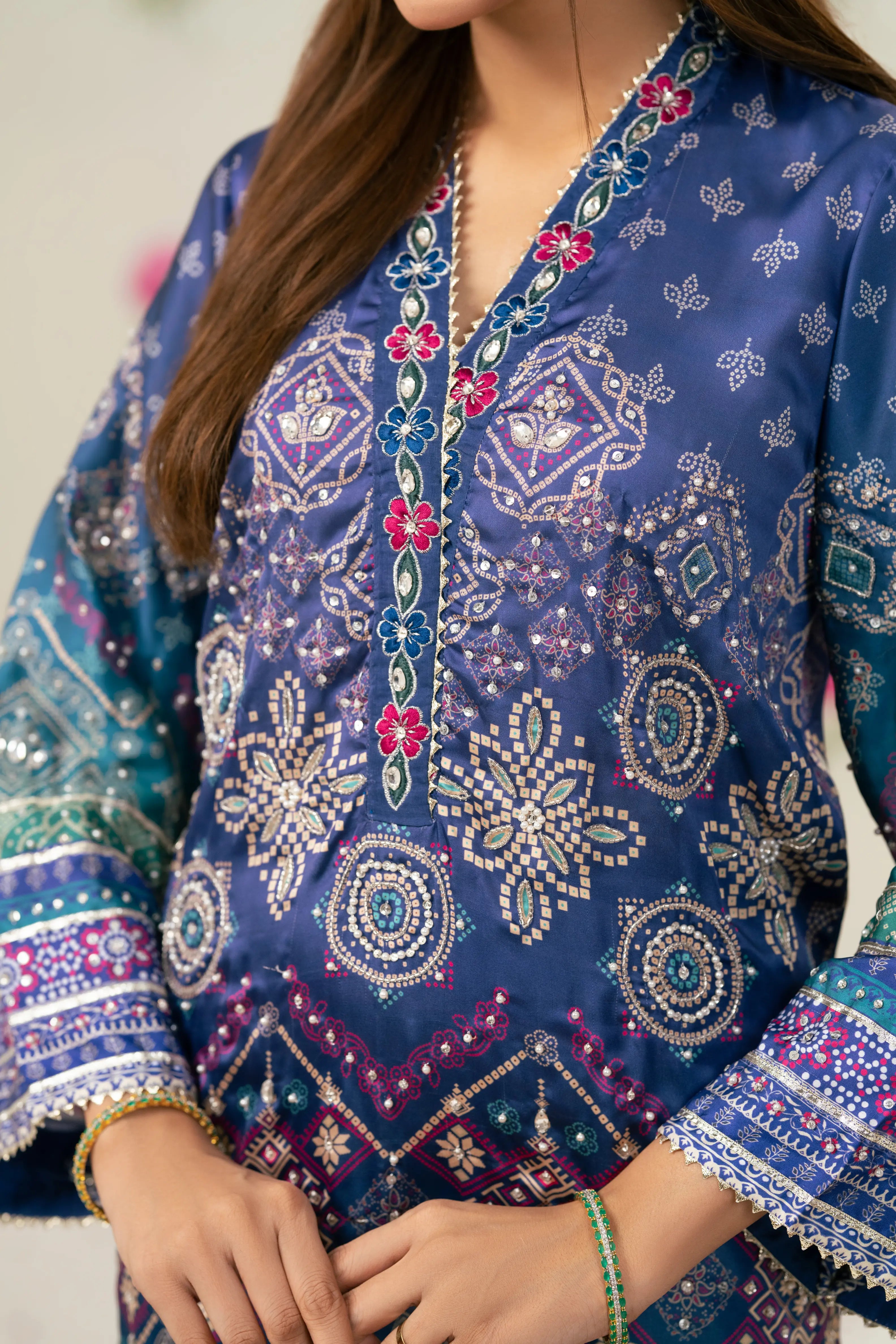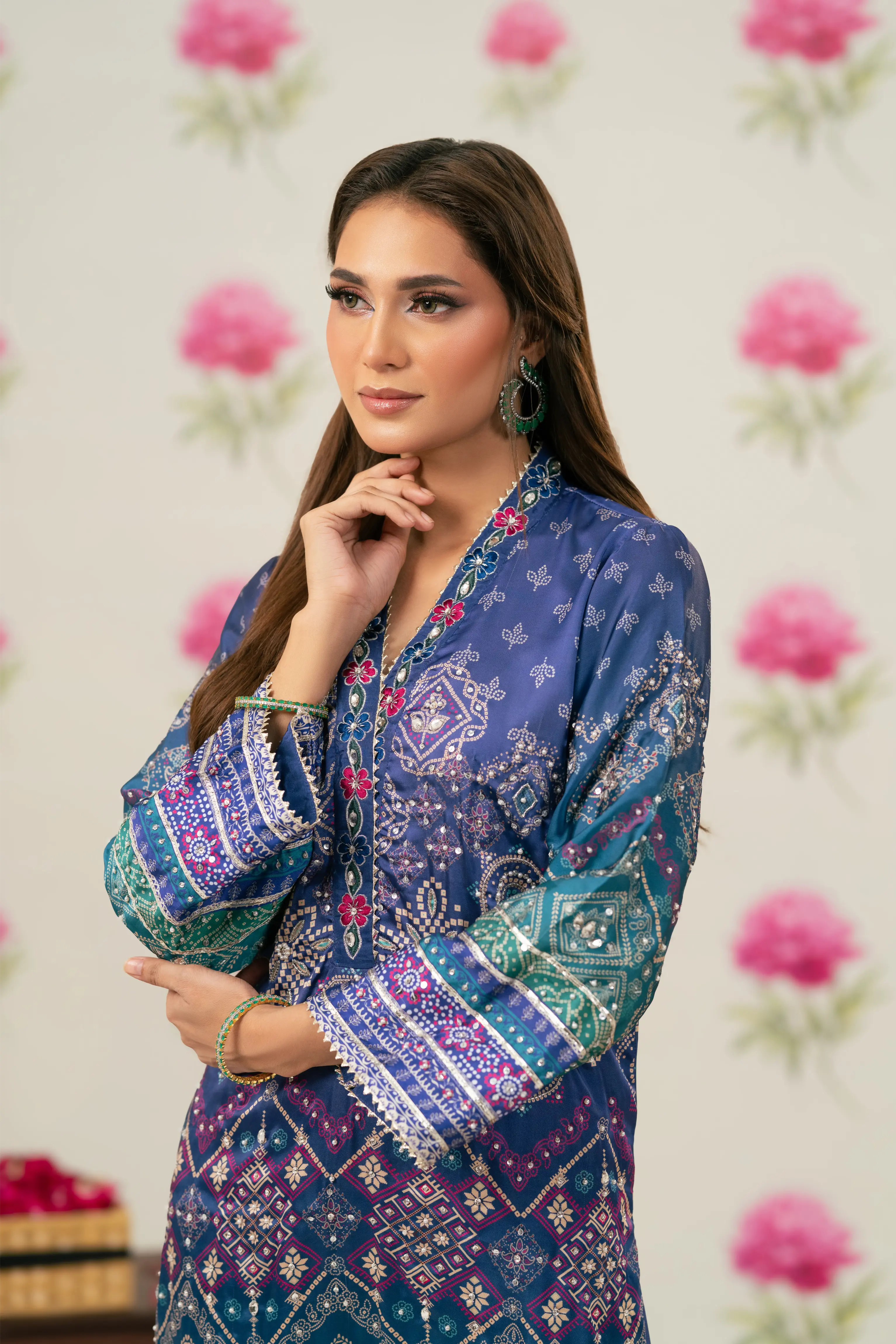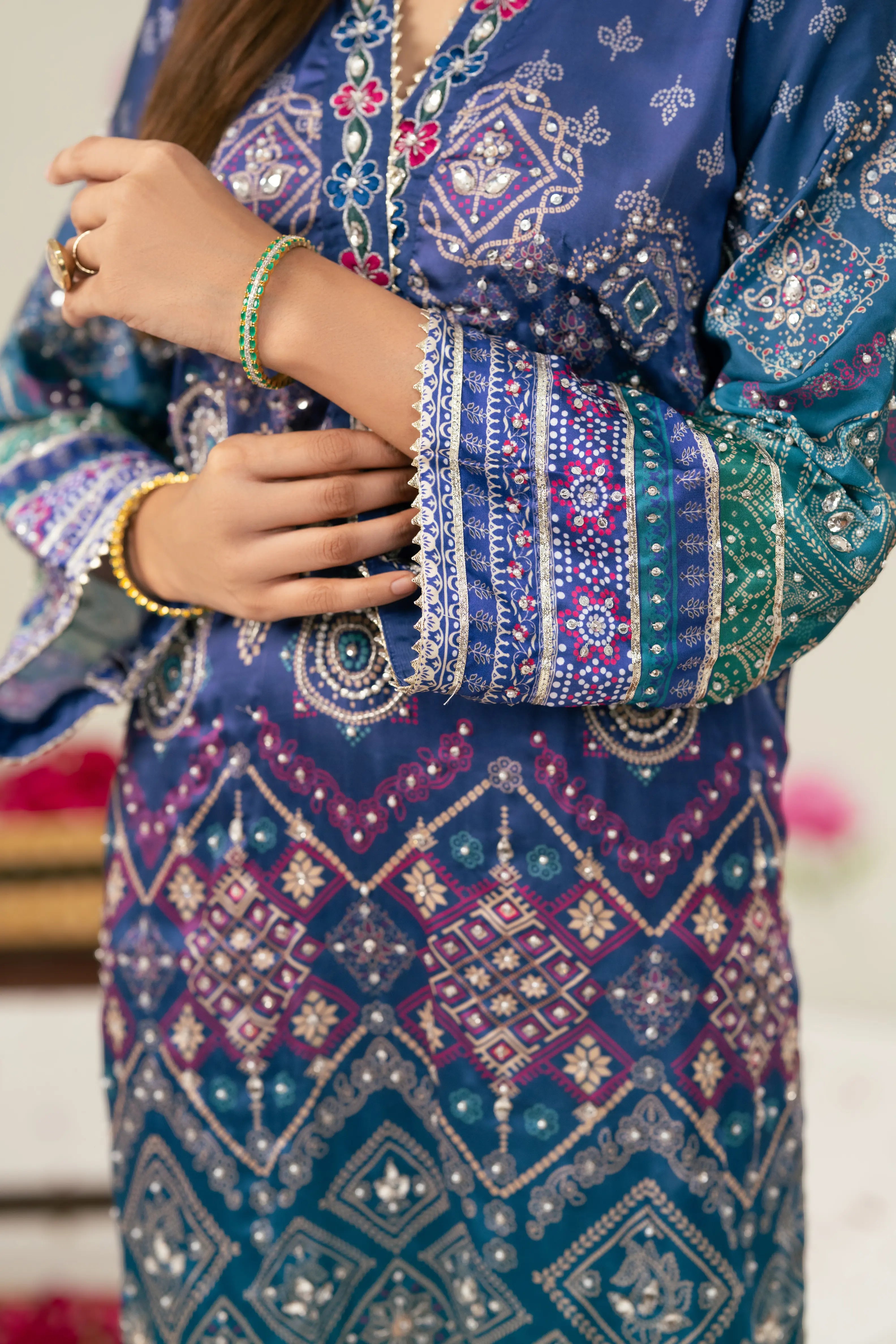 Luxe printed silk in rich ombré shades of deep navy blue, teal, and soft violet, finished with intricate detailing and statement borders. Delicate embroidery along the neckline is complemented by all-over hand embellishments featuring pearls, diamantés, gota, and dhanak, creating a refined festive shimmer. A perfect pick for evening celebrations, iftar meet-ups, and Eid occasions.