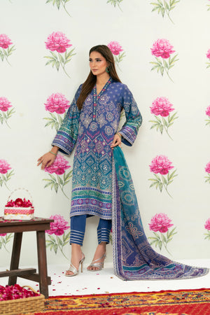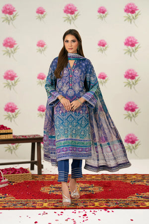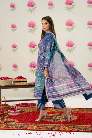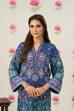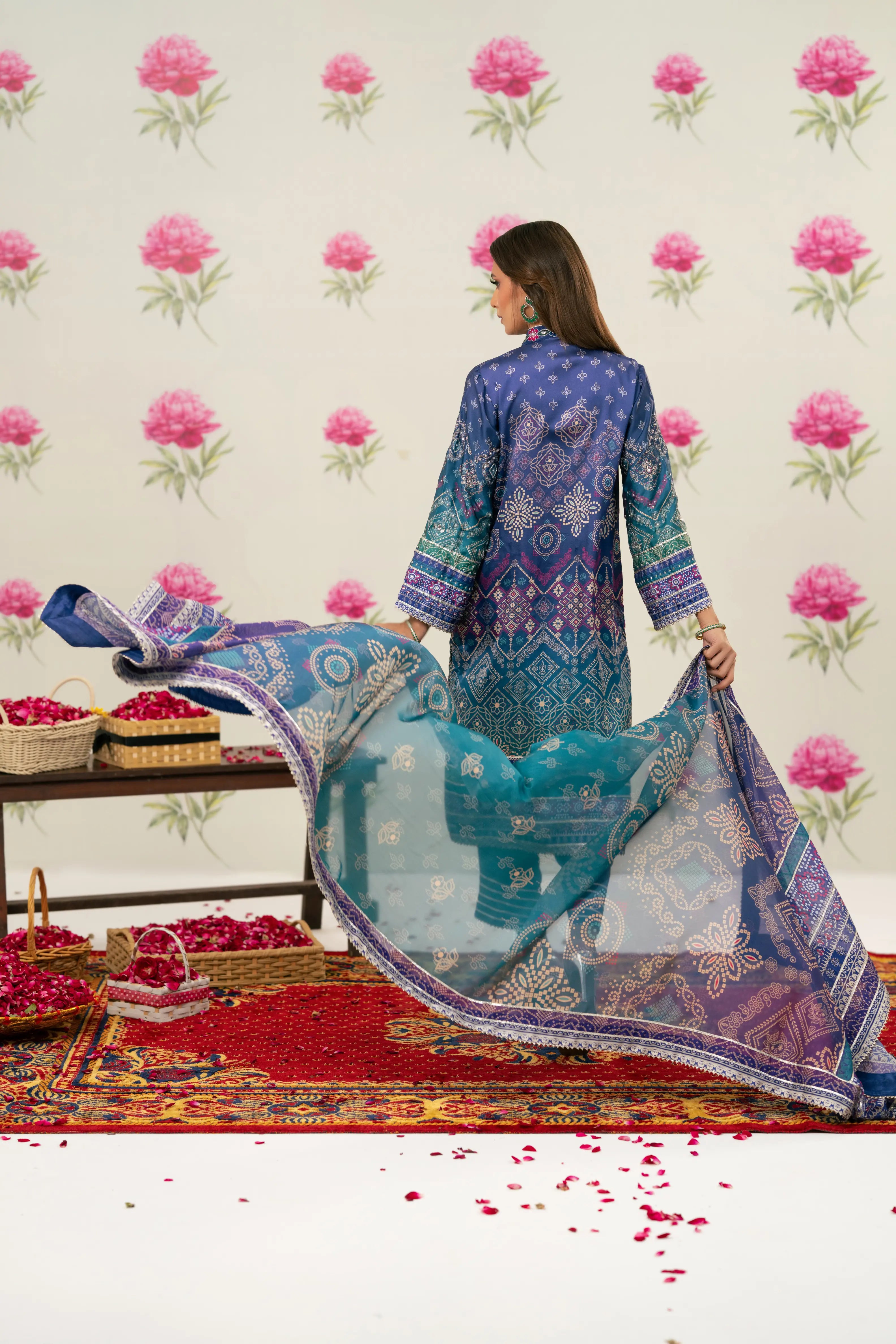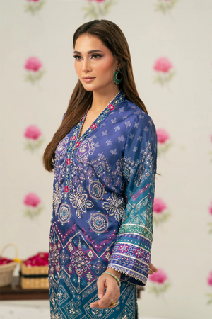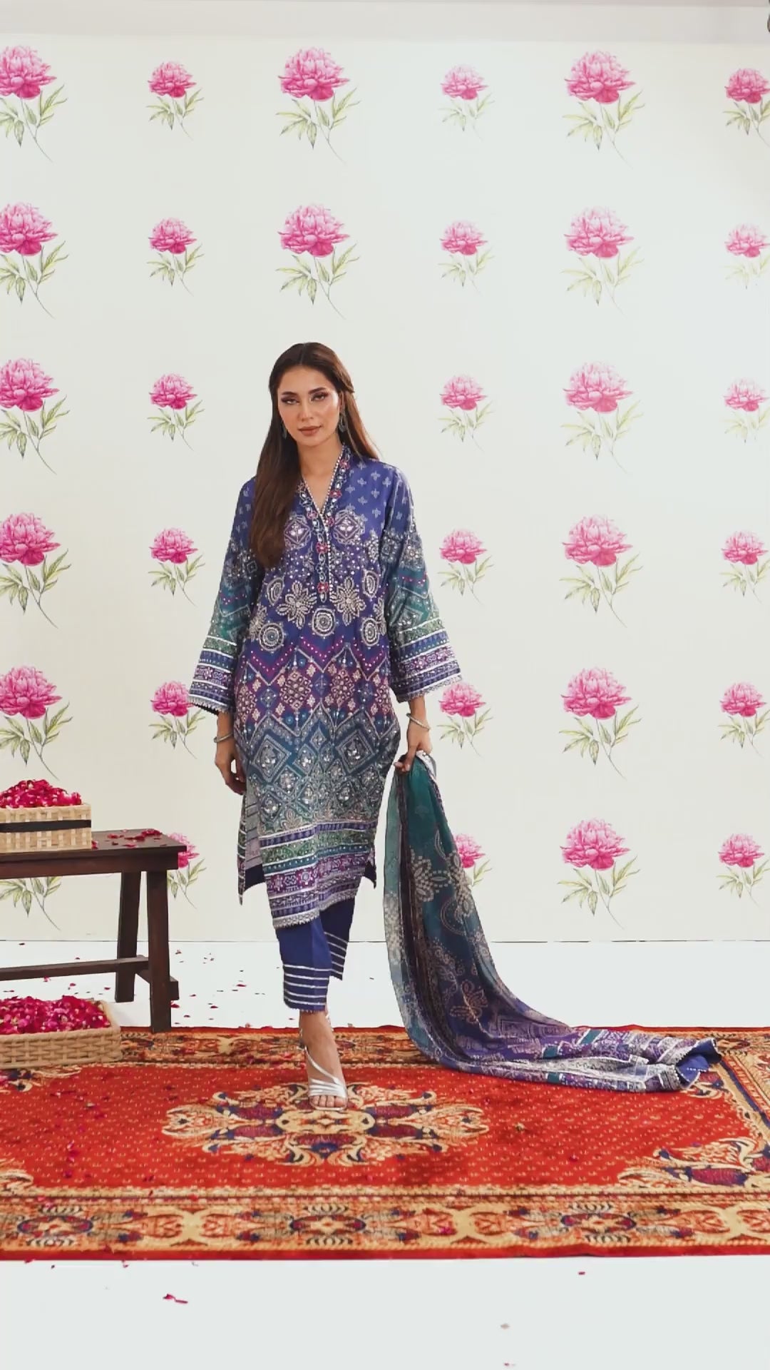 Luxe printed silk in rich ombré shades of deep navy blue, teal, and soft violet, finished with intricate detailing and statement borders. Delicate embroidery along the neckline is complemented by all-over hand embellishments featuring pearls, diamantés, gota, and dhanak, creating a refined festive shimmer. A perfect pick for evening celebrations, iftar meet-ups, and Eid occasions.
