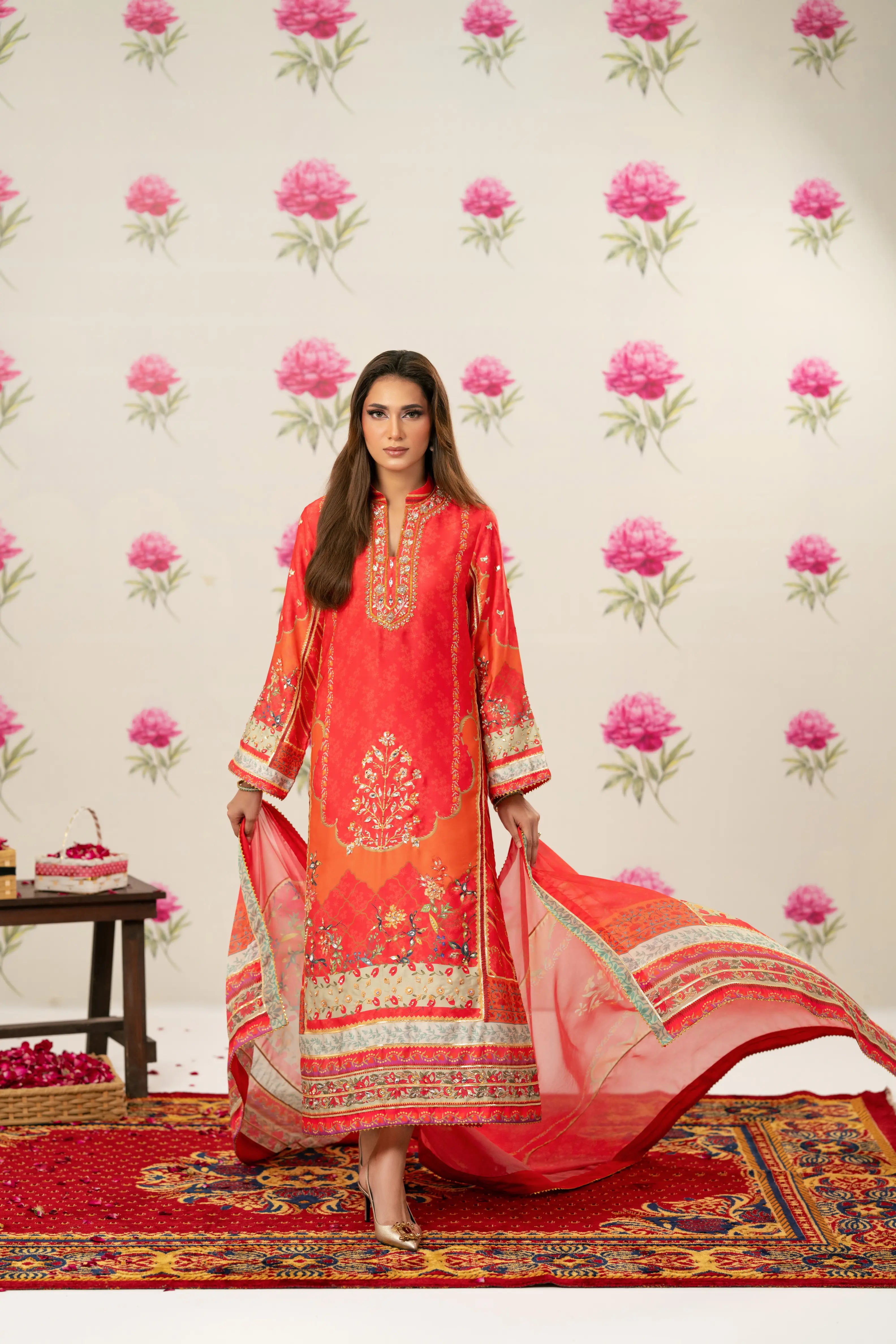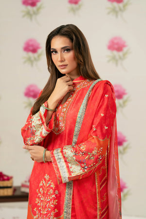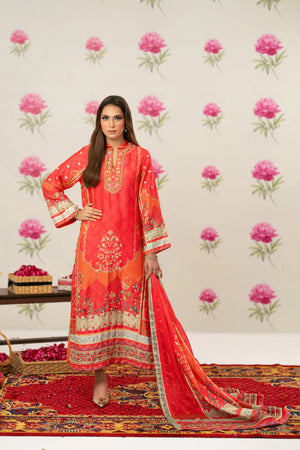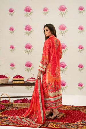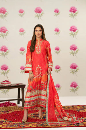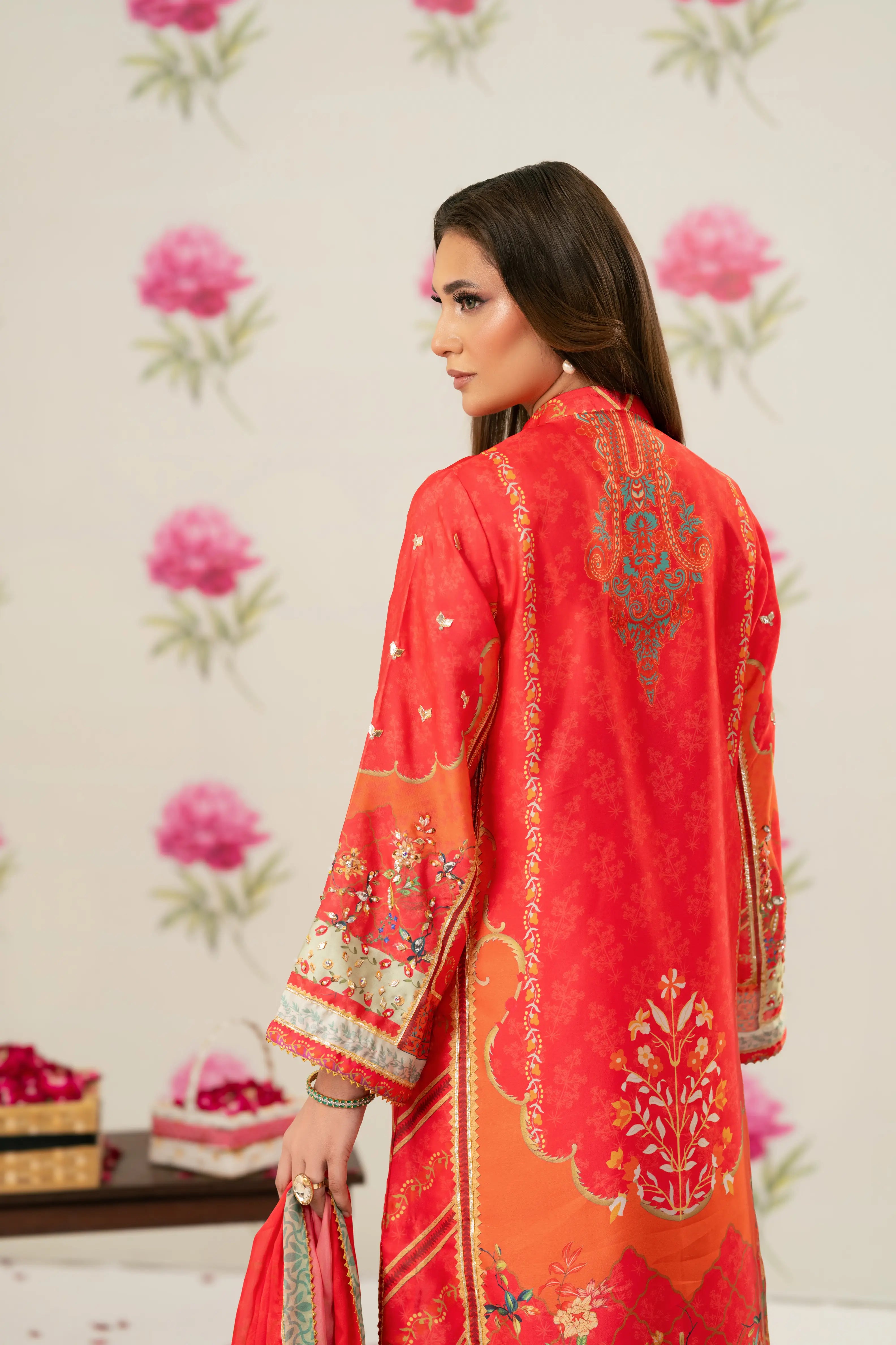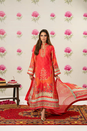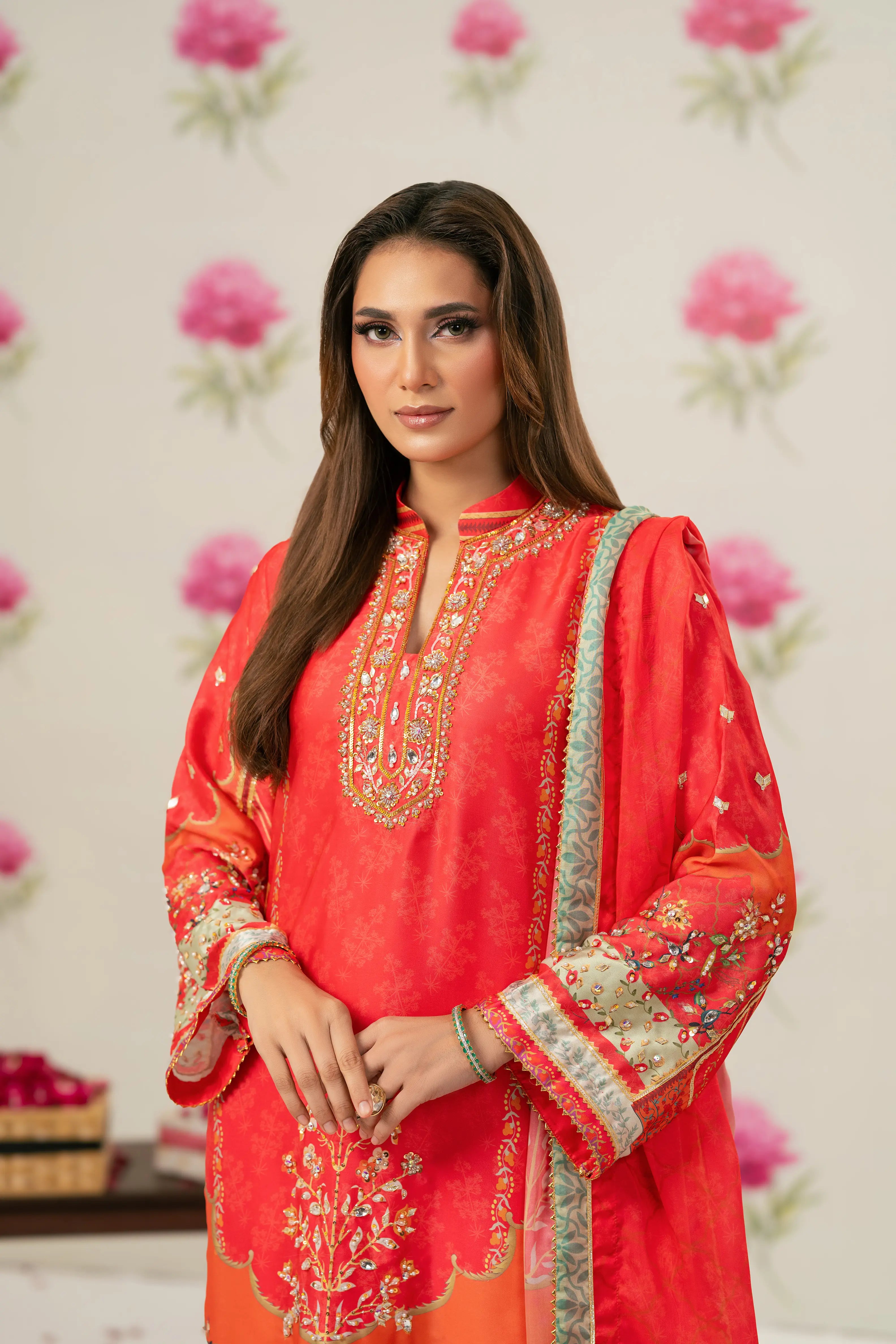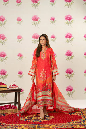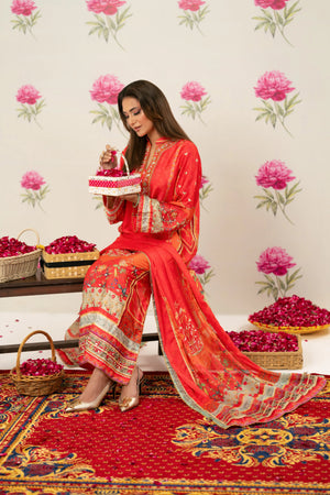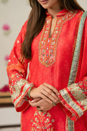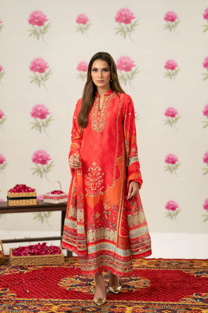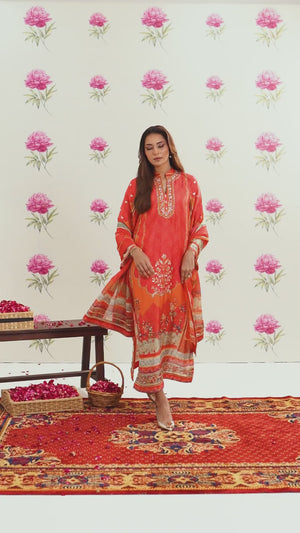 Radiant printed silk ensemble in rich coral and vermilion hues, beautifully accented with soft peach and antique gold tones. The design features delicate floral and ethnic motifs, finished with an ornate statement border that adds graceful movement to the silhouette. Intricate embroidery highlights the neckline, enhanced with subtle hand embellishments for a touch of festive elegance. Paired with a flowing, printed dupatta edged with detailed borders, this timeless piece is perfect for evening festivities, iftar gatherings, Eid celebrations, and formal festive occasions.