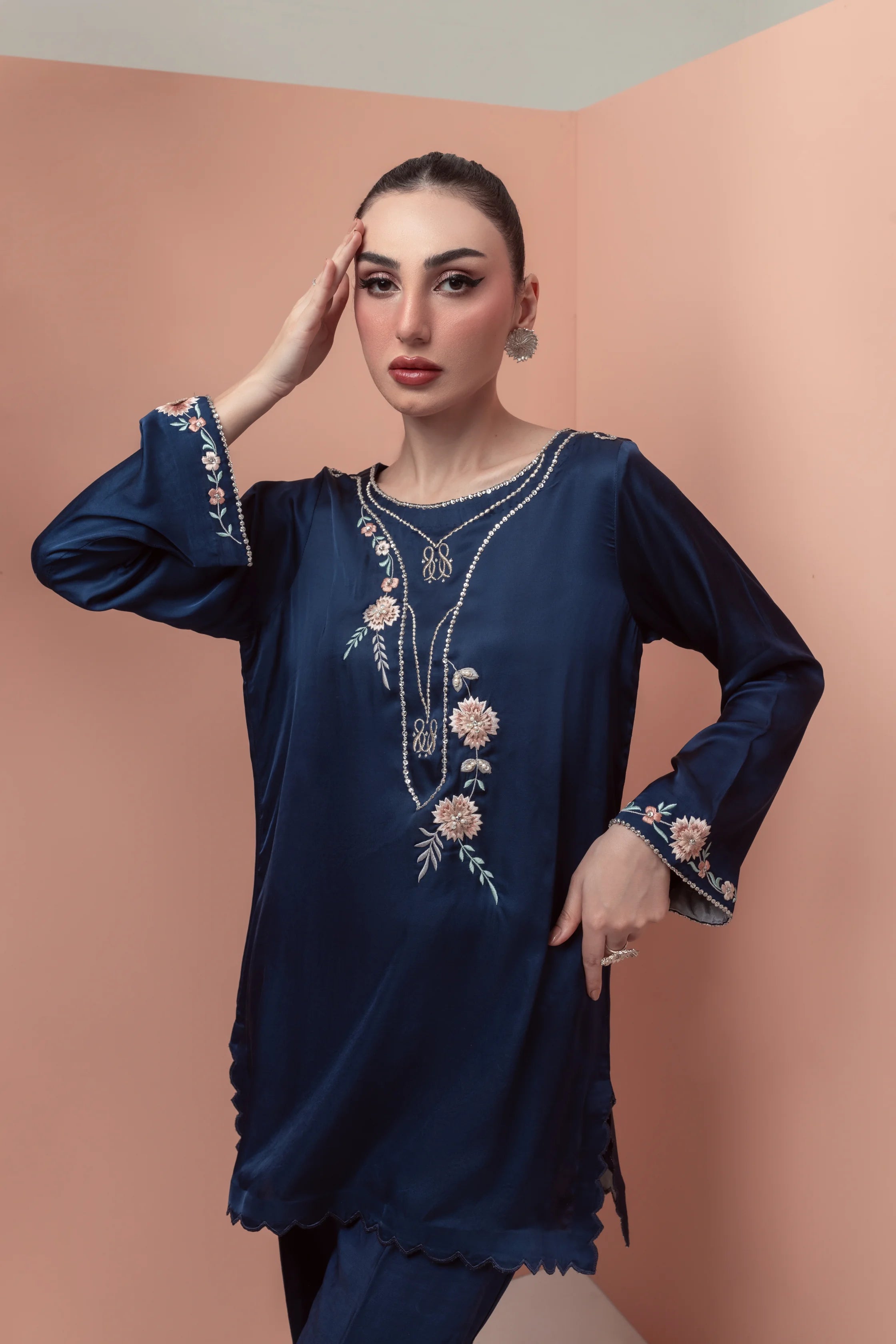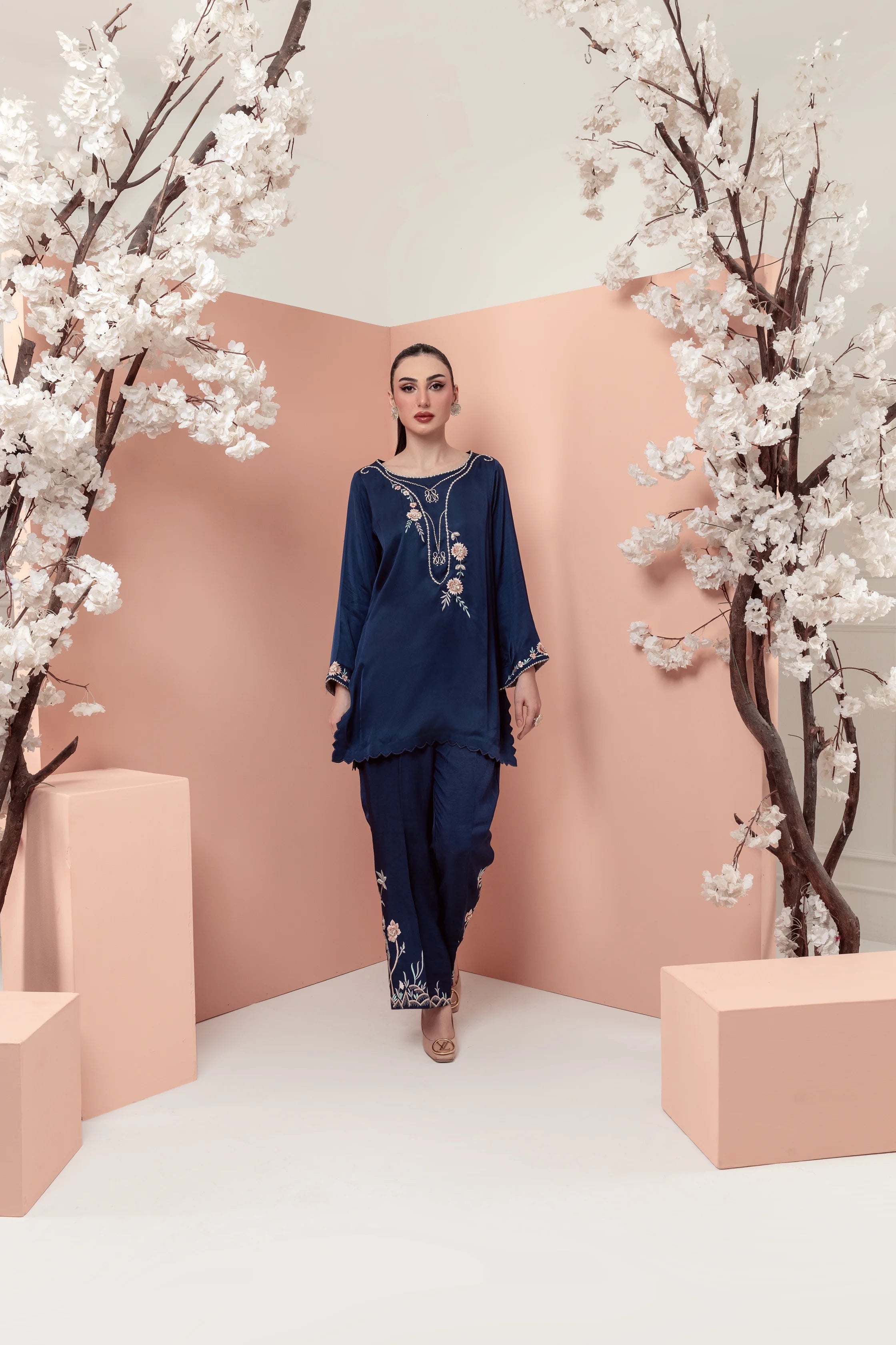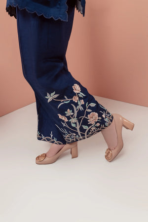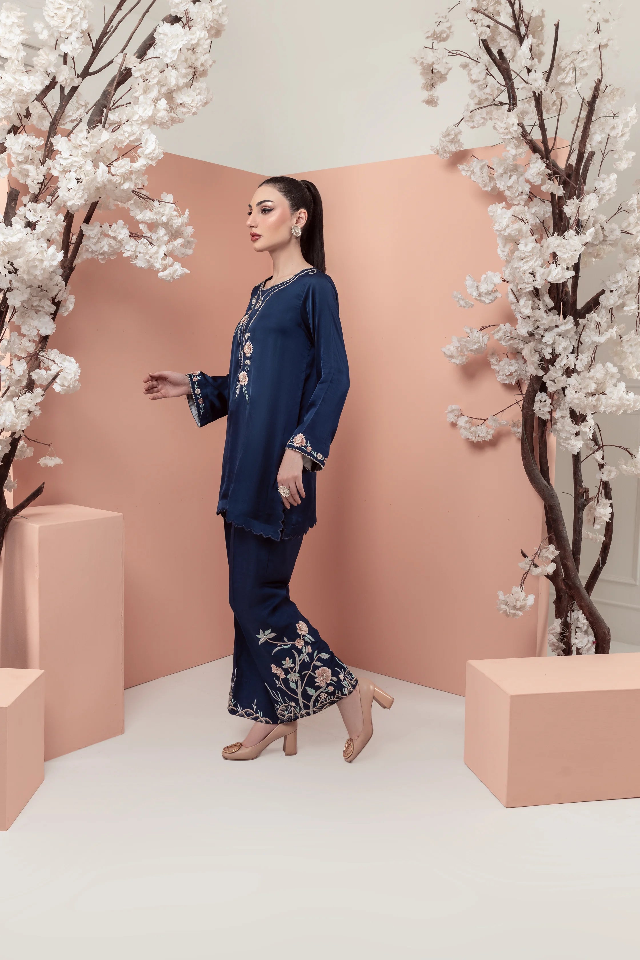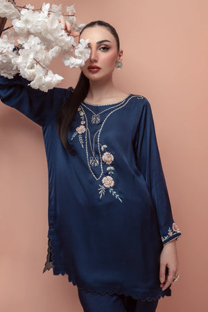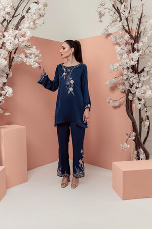 Majestic elegance blooms with 'Morning Glory', a stunning navy blue silk ensemble!
