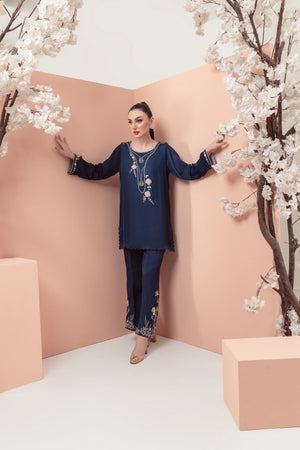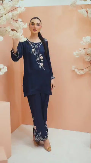 This captivating outfit features a short silk shirt with bootcut pants, boasting an intricately embroidered neckline in Resham, adorned with diamantés and delicate 3D flowers. The bootcut pants showcase exquisite embroidered bunches, intricately designed with delicate florals and foliage, adding a touch of sophistication to this refined ensemble.