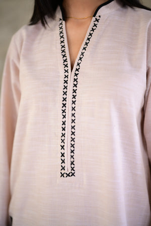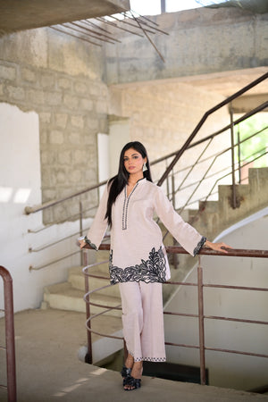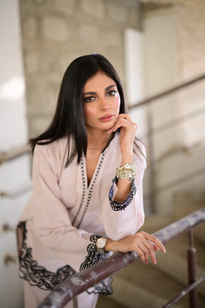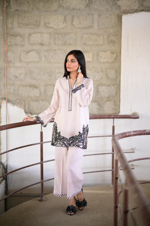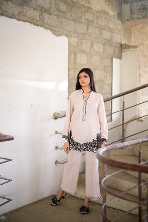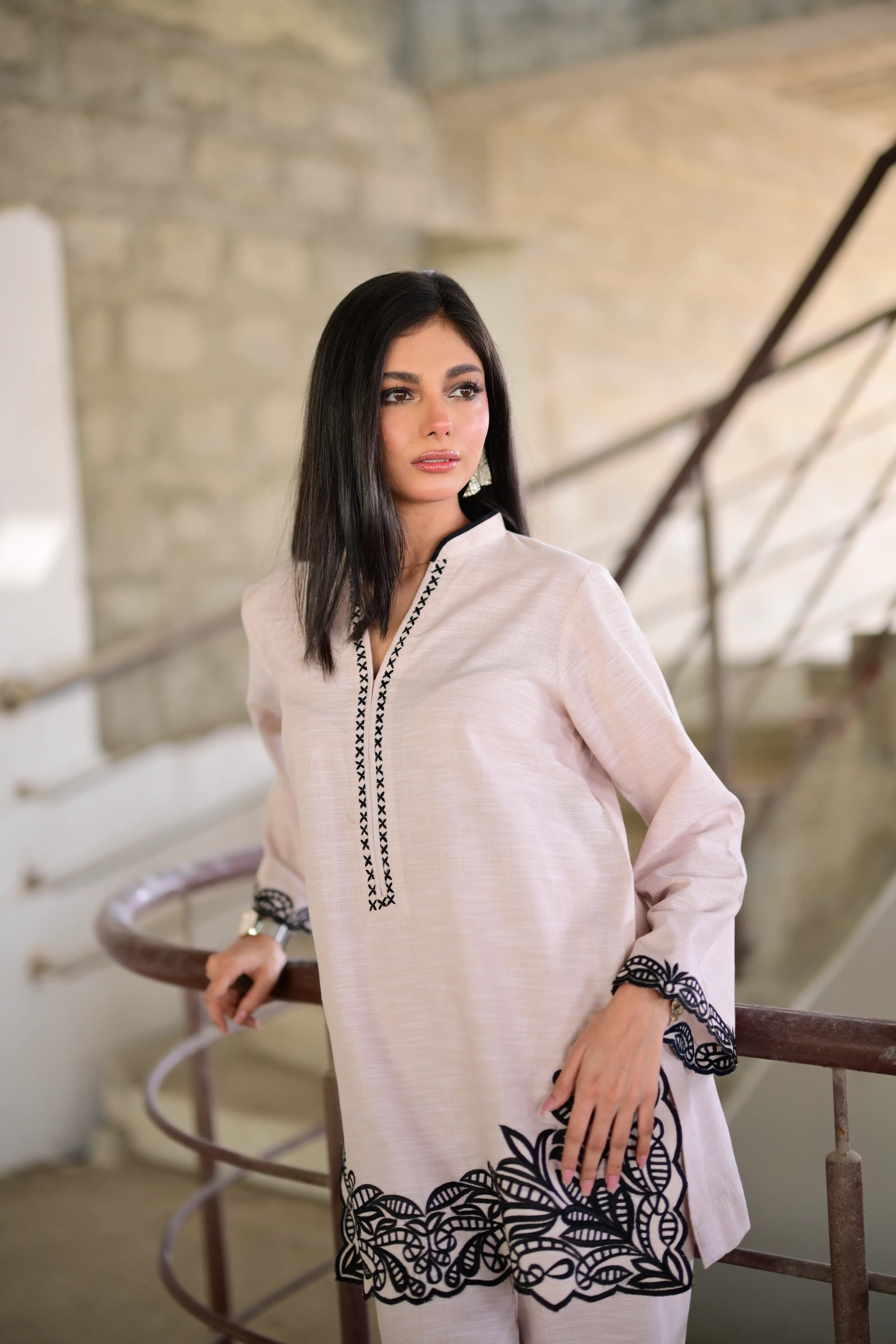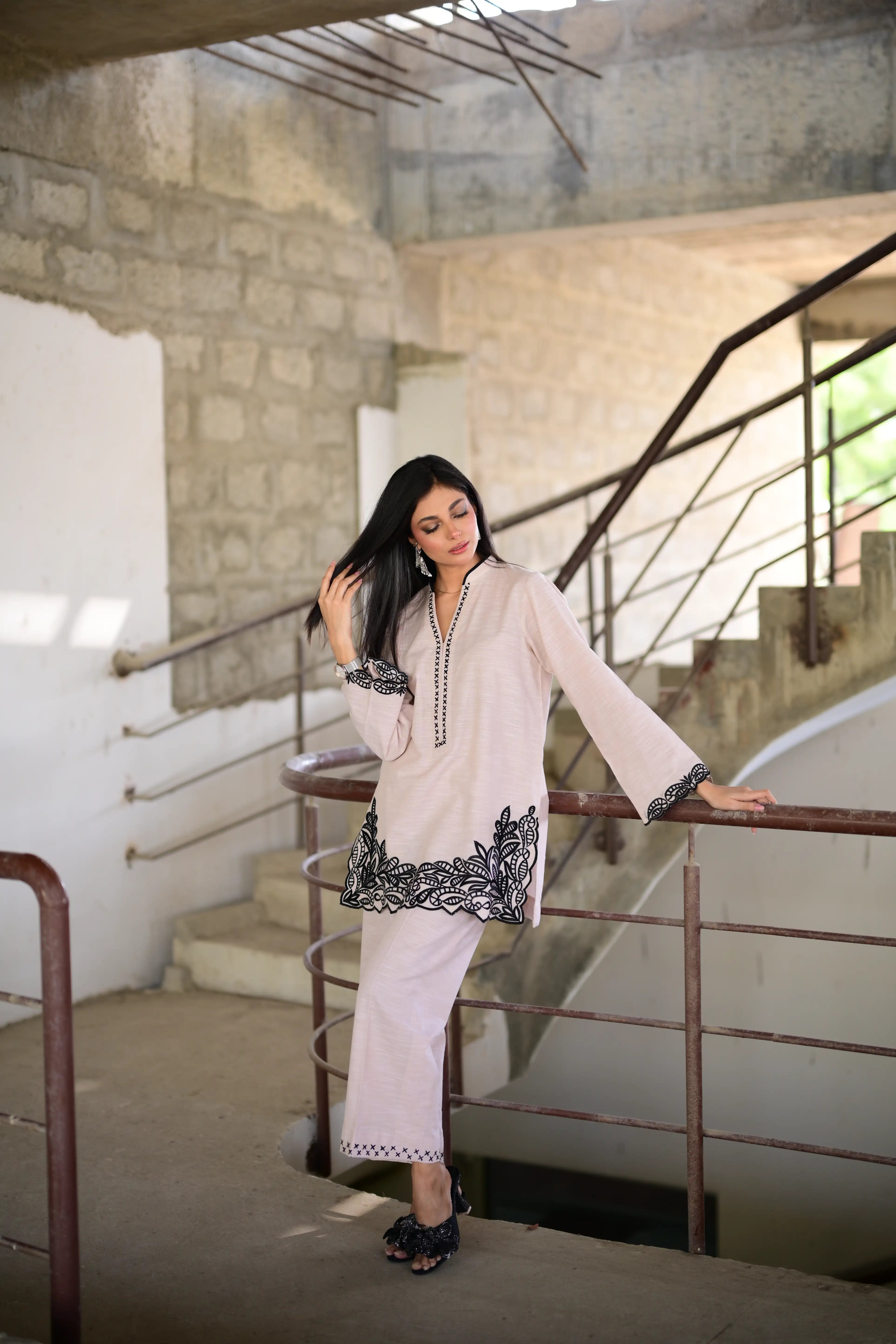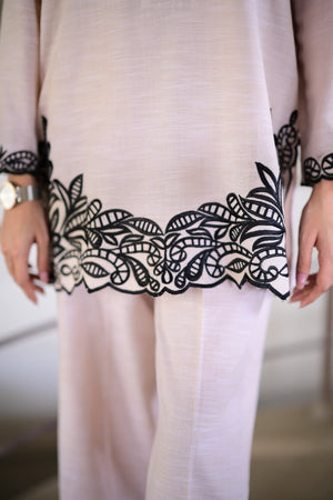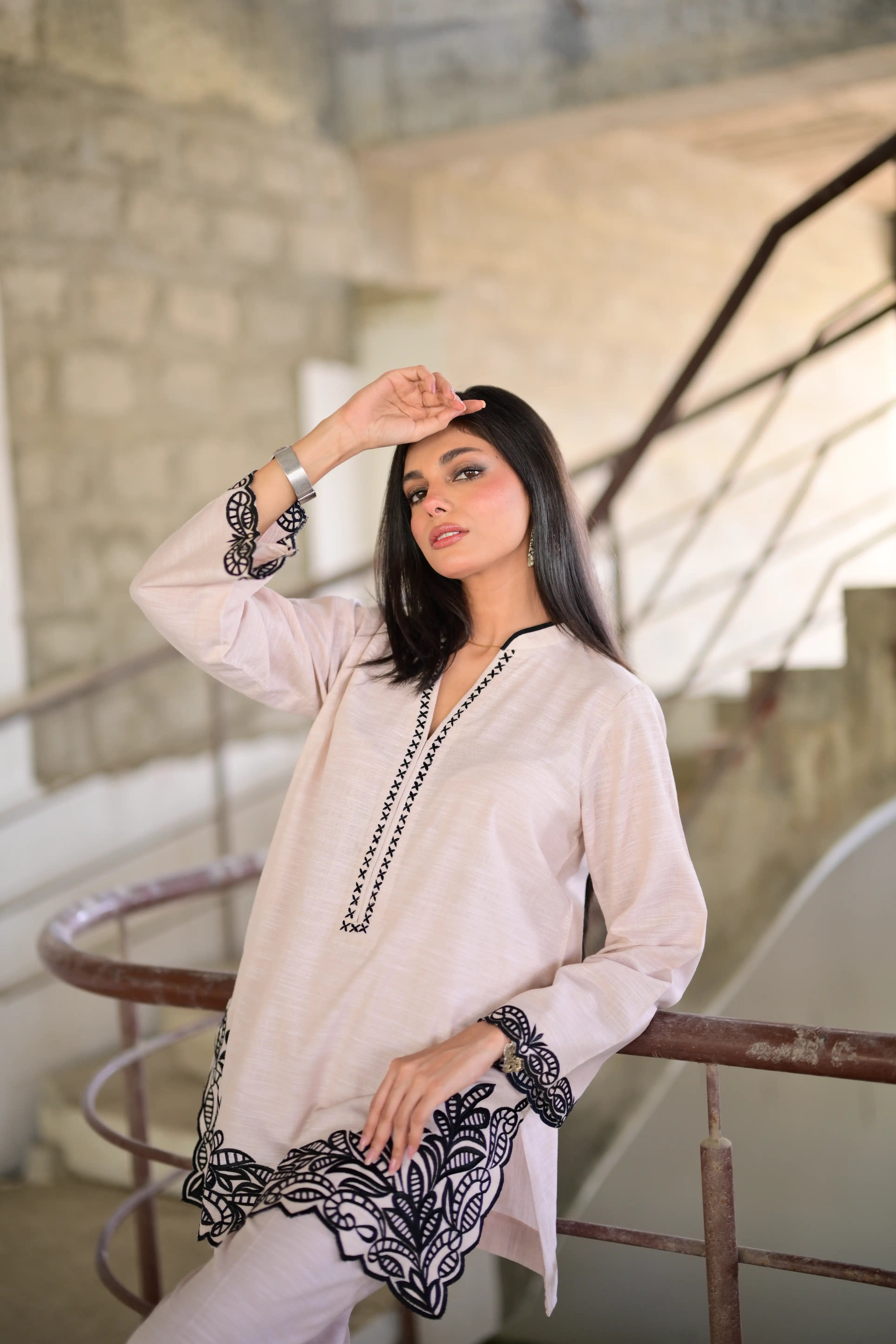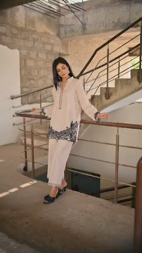 Experience the epitome of sophistication with our stunning beige Irish cotton 2-piece ensemble, beautifully adorned with intricate cutwork embroidery. The addition of chawal taanka on the pants adds an extra layer of intricacy and elegance. This exquisite outfit exudes refinement, perfect for making a statement on any occasion. Pair with statement accessories for added glamour.
