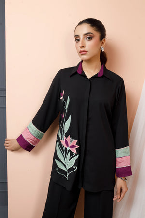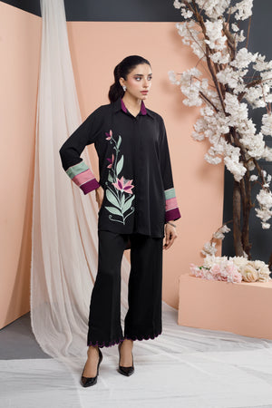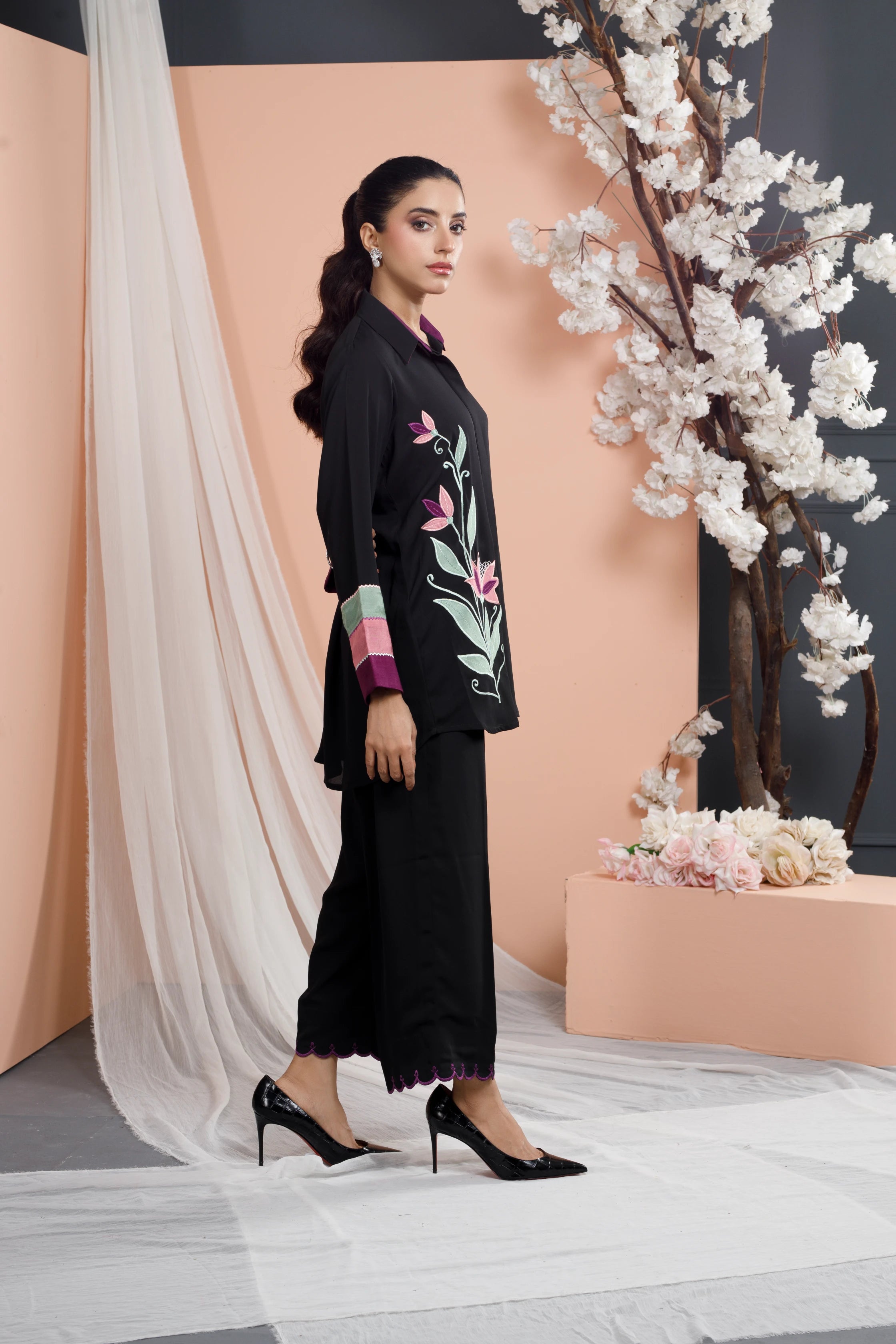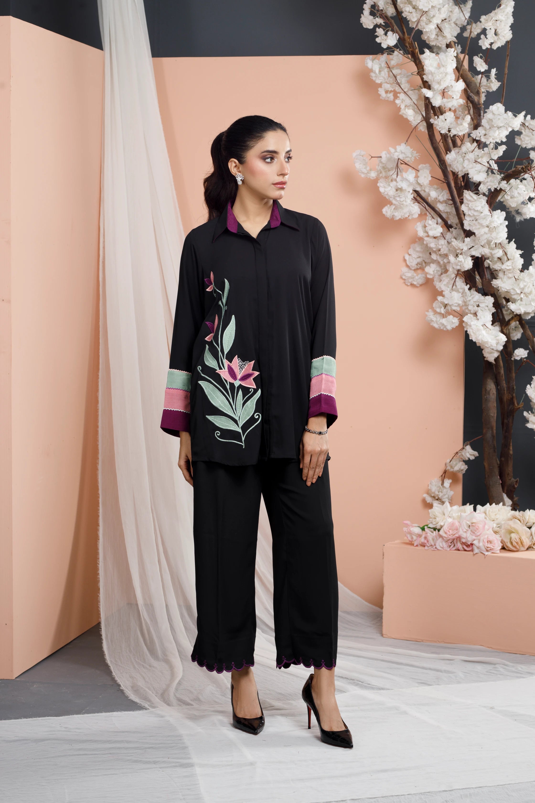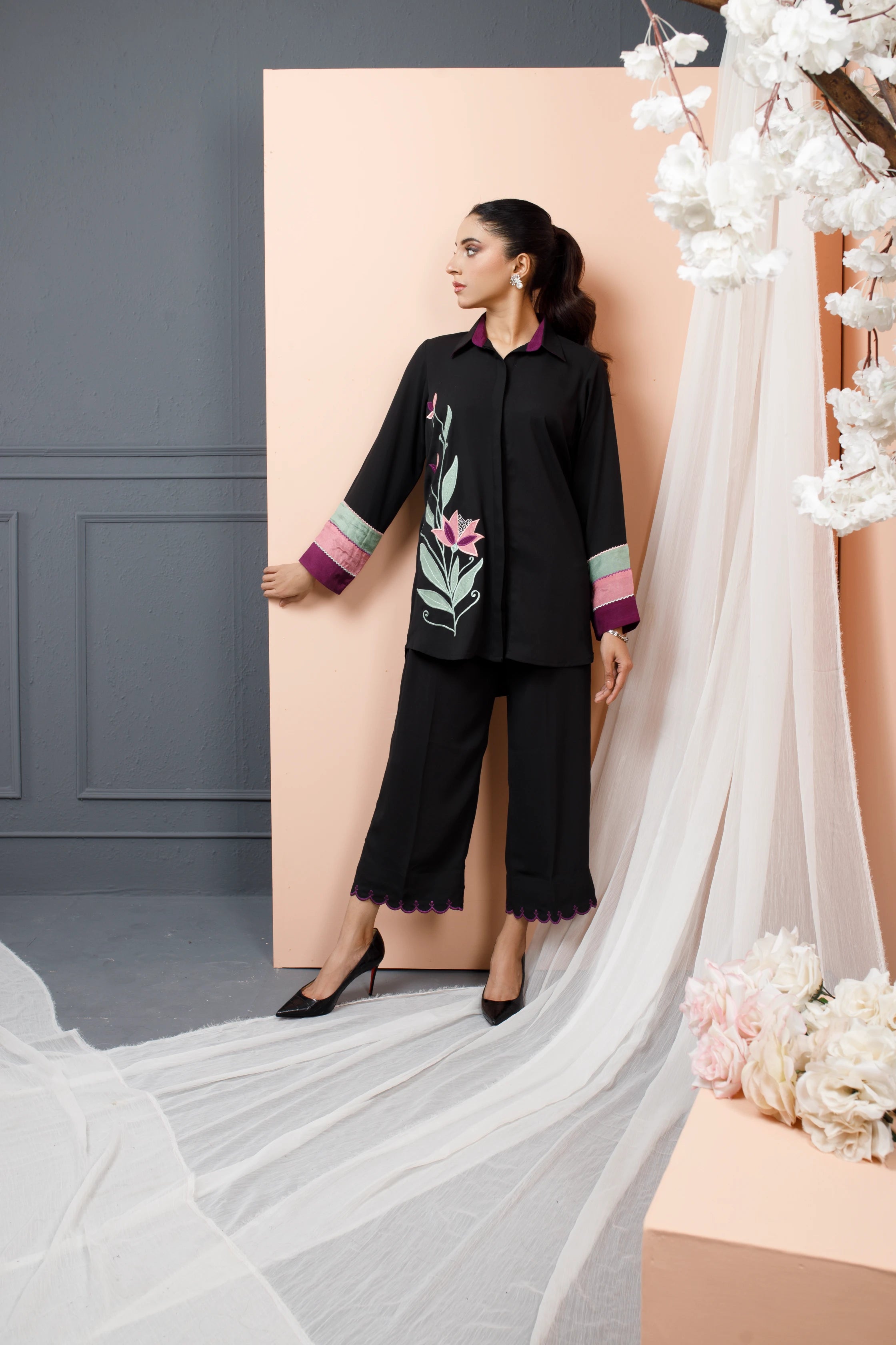 Elegance personified! This stunning black co-ord set is elevated by exquisite appliqué embroidery, featuring delicate floral motifs in soft pink, minty green, and rich purple hues. The collar and cuffs are thoughtfully accented with these same captivating colours, adding a touch of refinement. Paired with matching black pants boasting a subtle purple hem trim, this outfit exudes understated sophistication and poise, perfect for making a stylish statement.