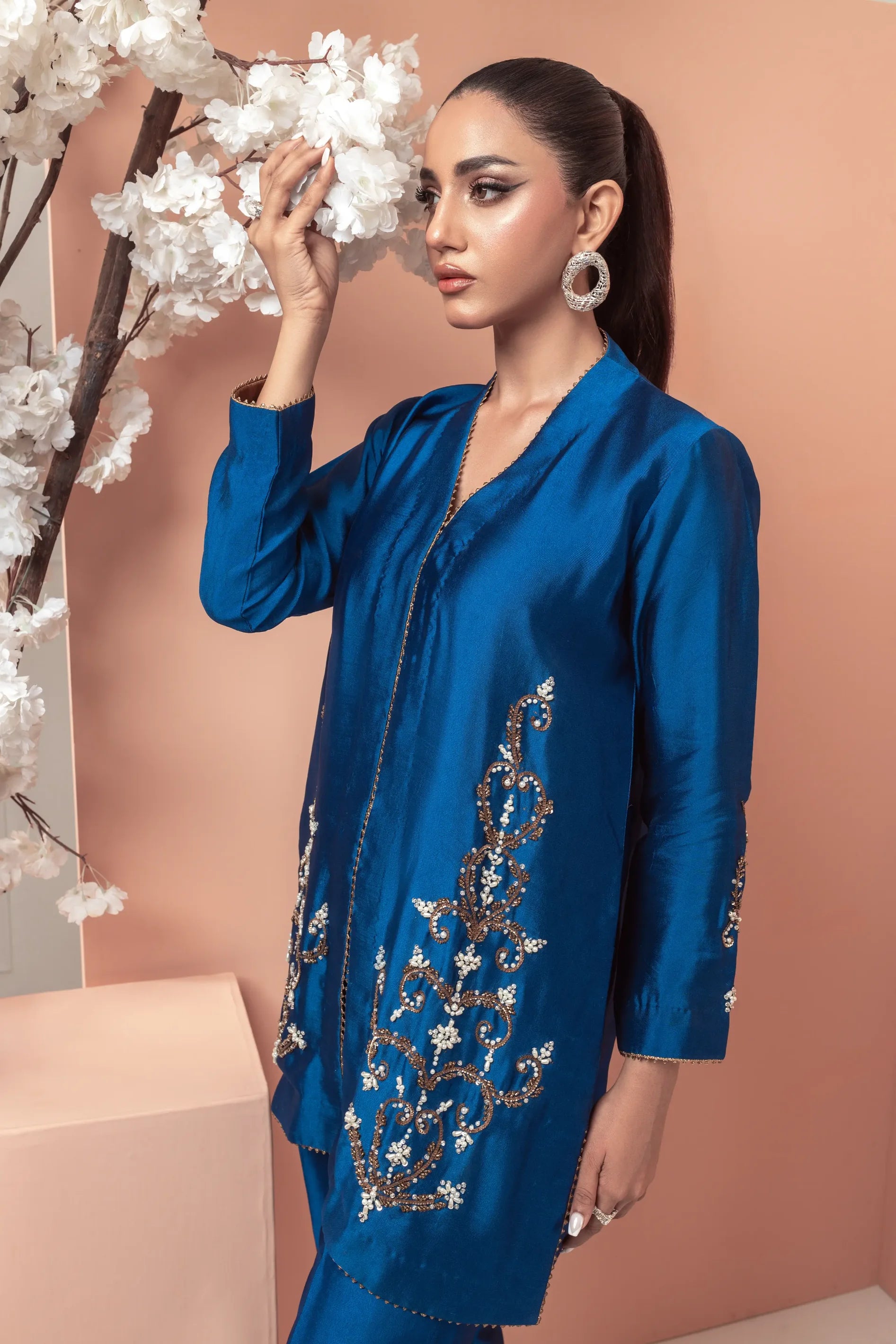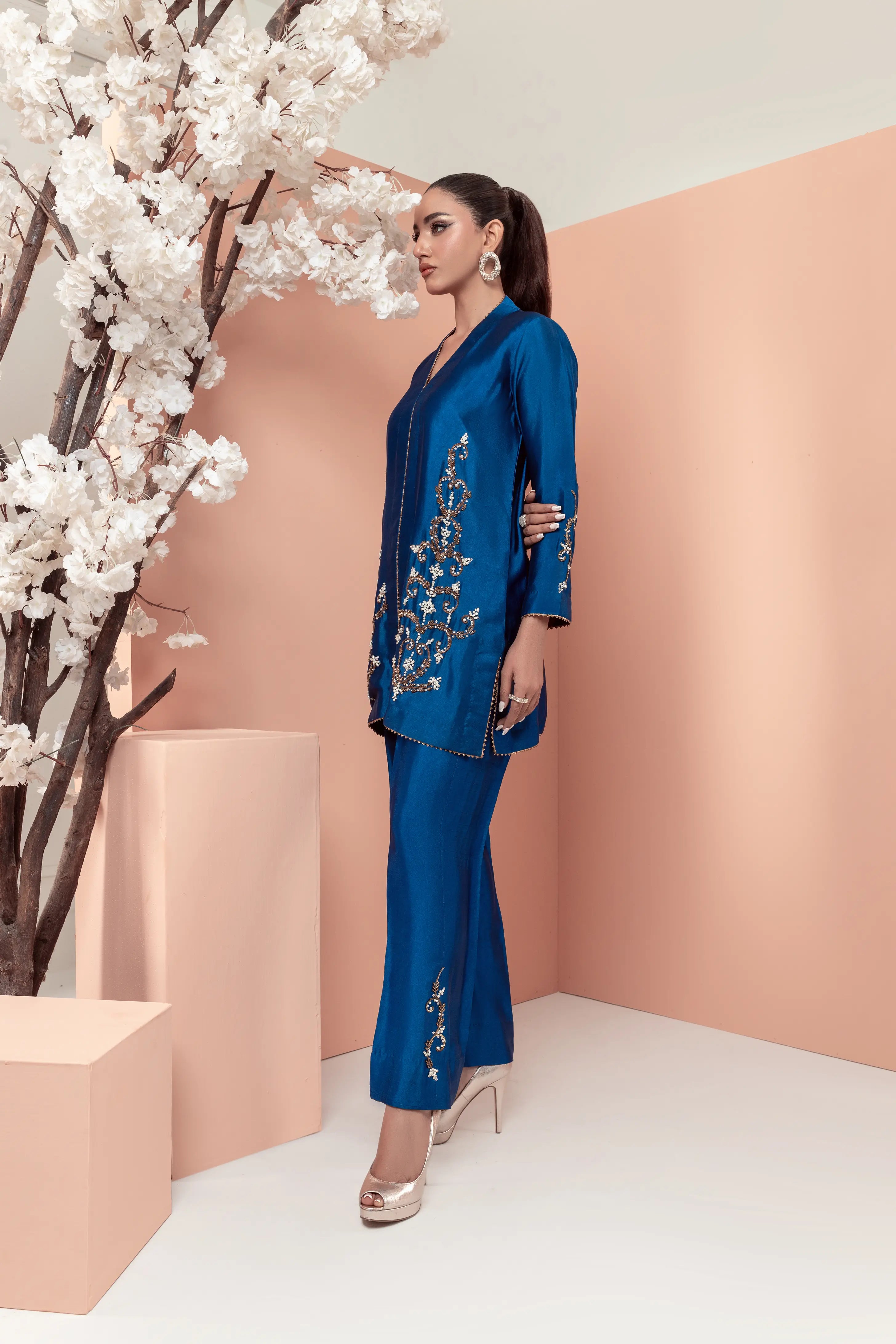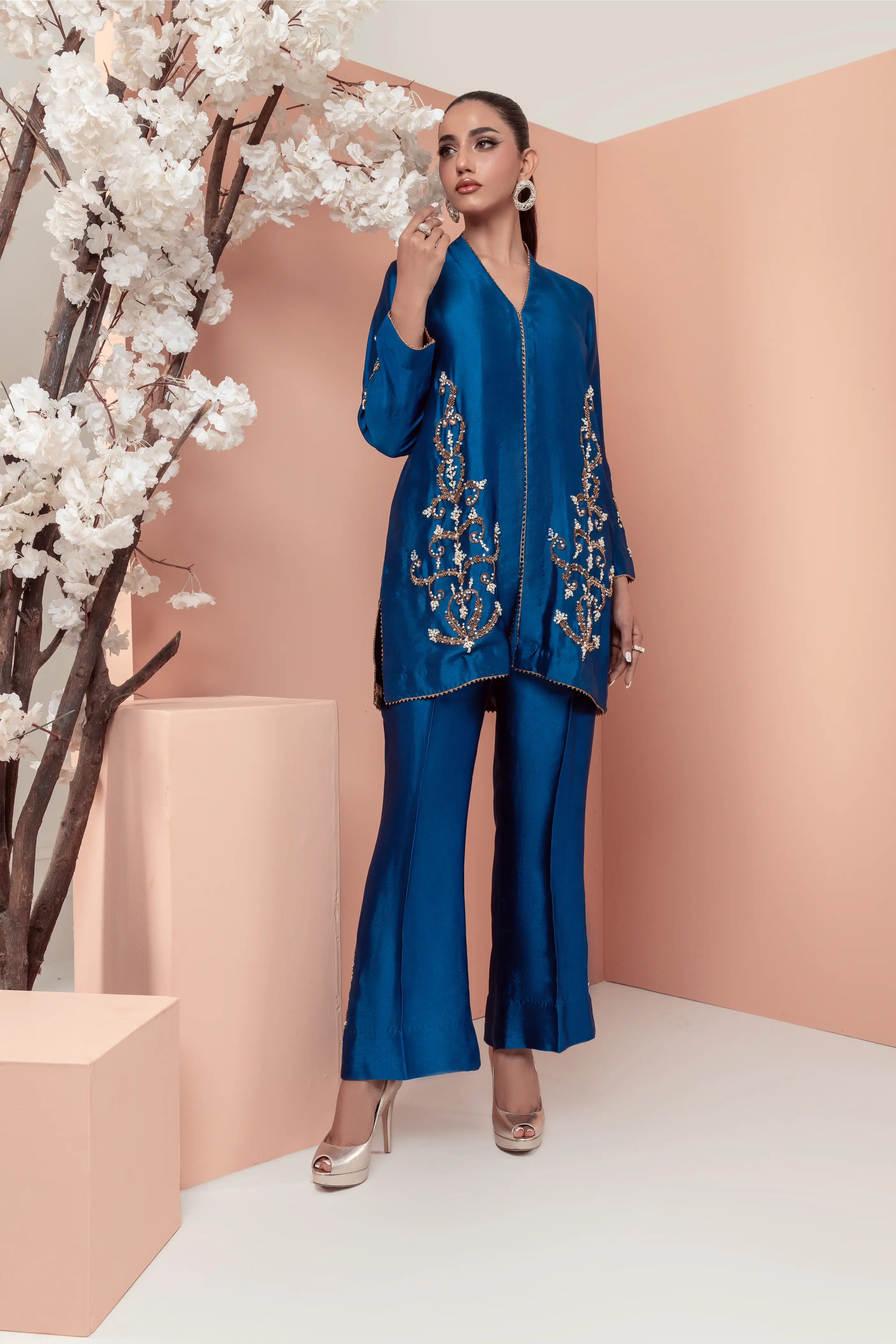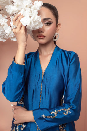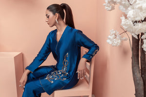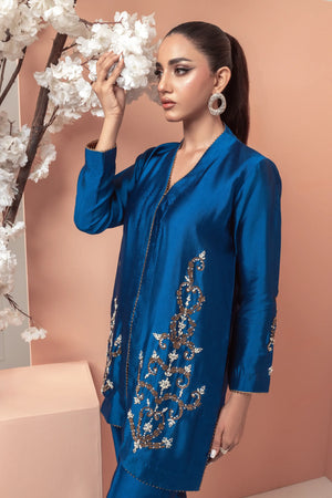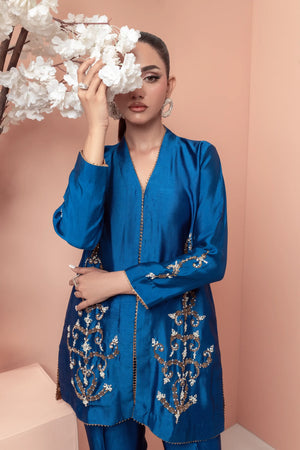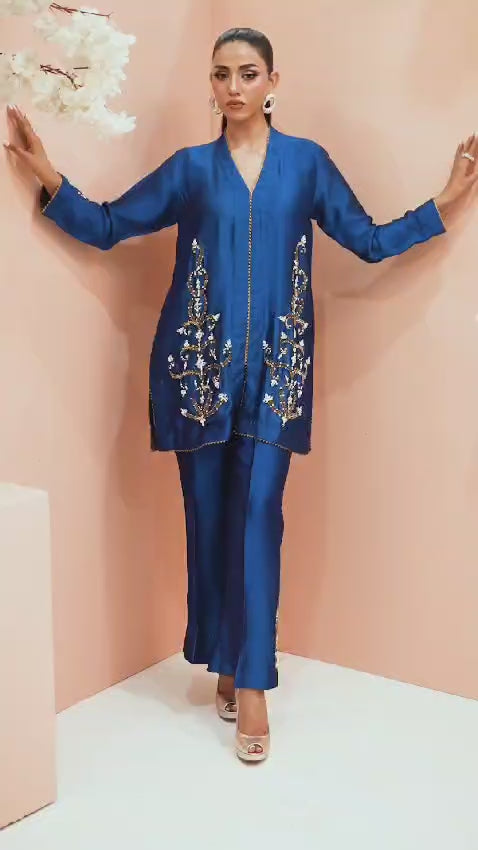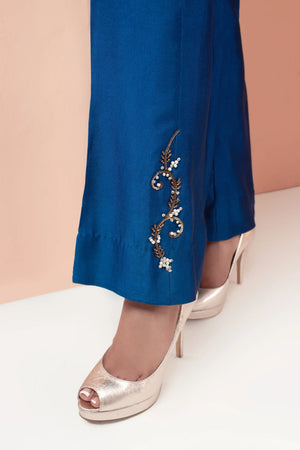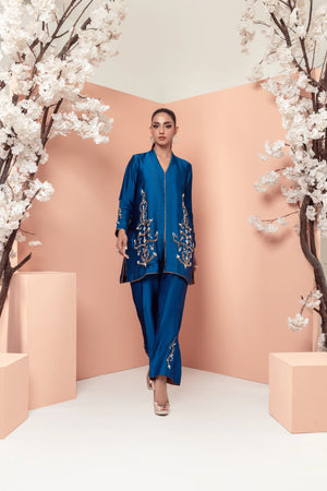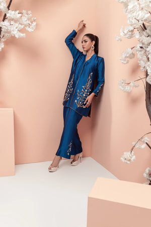 This stunning teal blue ensemble features a modern design with intricate work on the front of the shirt and sleeves. The bootcut pants add a stylish touch, while the motifs on the pants create a beautiful contrast. The copper accents add a earm and luxurious touch to the overall look making it perfect for those who want to make a statement with their fashion choices.